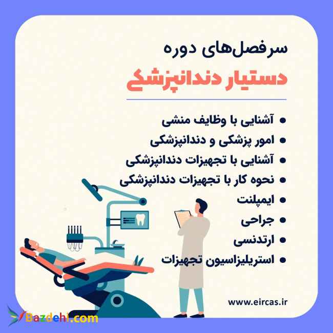 آموزش دستیاری دندانپزشک منشی امور پزشکی (تکنسین دندانپزشک یا کمک یار دندانپزشک) معرفی به کار سریع و جذب در مطب های دندانپزشکی سرتا سر تبریز * آشنایی با تجهیزات دندانپزشکی ****آشنایی با روش های استریل ** آشنایی با ابزر های جراحی **آشنایی با روش های ترمیم ** مواد پر کننده ** آشنایی با اصول منشی گری ** نوبت دهی **پذیریش بیمار و... * مجتمع آموزشی آپادانا(آموزشگاه آپادانا) مجری دوره های آموزشی اشتغال محور به صورت حضوری و مجازی(غیر حضوری ***معرفی به کار رایگان*** کلاسها به صورت تئوری و عملی می باشد دانشجویان پس از پایان دوره قادر به کار در مراکز دندانپزشکی خواهند ⬅شهریه دوره به صورت اقساطی قابل پرداخت میباشد .➡ ✅دوره های حضوری (آموزش دستیاری دندانپزشک) با رعایت کلیه پروتکل های بهداشتی در تایم های صبح ظهر و عصر ✅✅آموزش یک شغل پر درآمد *******پک آموزشی و جزوات رایگان******* مجتمع آموزشی آپادانا مجری برگزاری دوره های آموزشی اشتغال محور در شمال غرب کشور(دوره دستیاردندانپزشک در تبریز) سایر دوره ها: آموزش گیاهان دارویی آموزش کمک های اولیه آموزش نسخه پیچی داروخانه آموزش تکنسین آزمایشگاه آموزش تعمیرات تجهیزات پزشکی آموزش تعمیرات تجهیزات دندانپزشکی بورس و... آموزش طب سنتی در تبریز-آموزش گیاهان دارویی در تبریز-دوره های طب سنتی در تبریز-دوره های گیاهان دارویی در تبریز شماره تلفن چهار رقمی ما(برای تماس از شهر تبریز نیاز به گرفتن کد 041 نمی باشد.): 0414164 آدرس(برای ثبت نام به شعبه یک و دو مراجعه فرمایید): شعبه یک: خ آزادی-خ جدیری جنوبی ساختمان 17 شعبه دوم: سه راهی طالقانی روبه روی مصلی شعبه سوم: خ آزادی-بعد از رو گذر ابوریحان وبسایت: Eircas.ir واتساپ و تلگرام: 09393090595