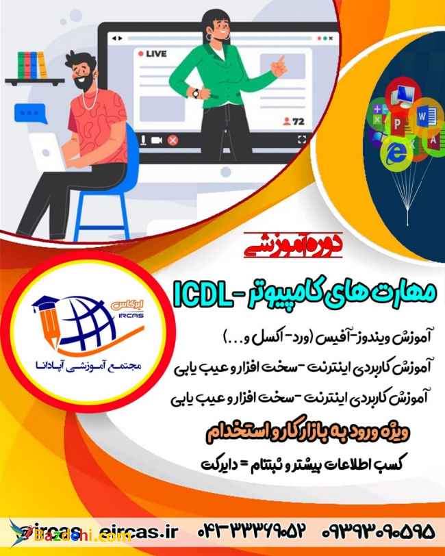 آموزش کامپیوتر در تبریز ، دوره ICDL در تبریز، تدریس تمام دوره های کامپیوتر برای تمامی سنین(افراد شاغل،کارمندان،دانشجویان،دانش آموزان و....)در‌آموزشگاه معتبر در تبریز تدریس مهارتهای هفتگانه ICDL به صورت تکی تدریس مهارت های هفتگانهICDL به صورت یکجا شامل: مبانیIT- ویندوز- اینترنت- ورد-اکسل- پاورپوینت-اکسس ارایه مدرک درون آموزشگاهی ،بین المللی،وفنی حرفه ای جهت ارائه به موسسات و ادارات دولتی و خصوصی برای استخدام تدریس کل دوره در یک هفته برای کسانی که برای استخدام به مدرک نیاز دارند. پرداخت شهریه به صورت تمام اقساط برای استعلام قیمت و زمانبندی دوره های آموزشی با کارشناسان این مجموعه تماس حاصل فرمایید. ICDLآموزش کامپیوتر-آموزش اکسس-آموزش اکسل در تبریز-آموزش اینترنت-آموزش پاورپوینت-آموزش ورد در تبریز-آموزش مهارت های رایانه در تبریز-آموزش رایانه-آموزش مهارت های هفت گانه-مدرک رایانه-مدرک کامپیوتر در تبریز-مدرک ICDL- در تبریز-گواهینامه ICDL در تبریز-آموزشگاه کامپیوتر در تبریز تماس: 04133369052 04133369053 04133369054 آدرس: شعبه یک:خ آزادی-خ جدیری جنوبی ساختمان 17 شعبه دوم:سه راهی طالقانی روبه روی مصلی وبسایت: Eircas.ir واتساپ و تلگرام :09393090595