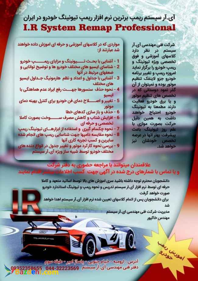 شرکت فنی مهندسی آی.آر سیستم برای دانشجویانی که تمایل به شناخت و یادگیری اصولی ریمپ خودروها رو دارند سری اموزشهای کاملا تحصصی ویژه نرم افزار آی.ار سیستم را برنامه ریزی نموده است سرفصل ها : افزایش شتاب افزایش گشتاور و توان موتور رفع کپ دریچه گاز کاهش دمای فن دور تند کاهش دمای فن دور کند حذف کات آف حذف سنسور دوم اکسیژن حذف سنسور میل سوپاپ کاهش مصرف سوخت ایسیو های زیر در این دوره تدریس می شود : تمامی مدل های زیمنس تک سوز تمامی مدل های زیمنس دوگانه سوز ایسیو های بوش شامل : ME7.4.4 – ME7.4.5 – ME7.4.9 ایسیو S2000 ایسیو J34 ایسیو SSAT دوره ریمپ ECU پیشرفته : سرفصل ها : افزایش شتاب افزایش گشتاور و توان موتور رفع کپ دریچه گاز کاهش دمای فن دور تند کاهش دمای فن دور کند حذف کات آف حذف سنسور دوم اکسیژن حذف سنسور میل سوپاپ کاهش مصرف سوخت حذف سنسور اکسیژن اول اعمال یا حذف محدودیت سرعت حذف ایموبلایزر آموزش چک سام گیری دستی و با نرم افزار ای.آر سیستم تنظیم دور آرام idea ضمن اینکه در پایان دوره نرم افزار قدرتمند آی.آر سیستم ریمپ برترین نرم افزار ریمپ تیونینگ ایران و آسیا به دانشجویان جهت تیونینگ اهدا خواهد شد برای هماهنگی میتوانید ضمن مطالعه اگهی با شماره درج شده و یا ادرس دفتر هماهنکی خود را اعلام فرمایید دفتر فنی مهندسی آی.آر سیستم شماره های تماس: 09149362166 09352358655 آدرس: خیابان خیام جنوبی،پاساژ امید طبقه سوم تلفن ثابت: 044-32223569 آدرس سایت: http://Www.irsystemtunning.com