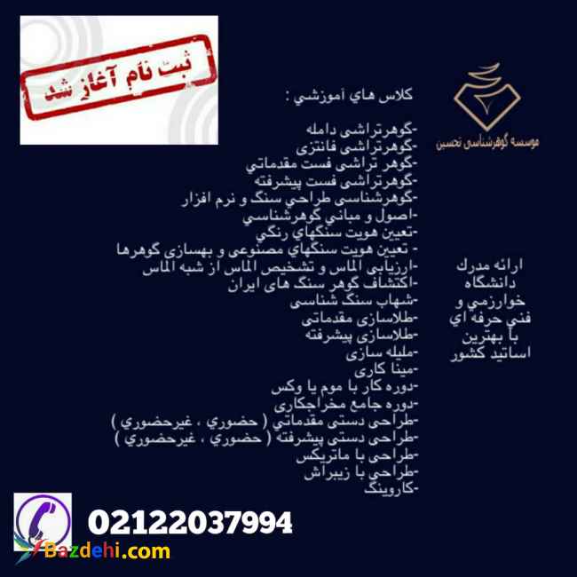 برگزاری دوره های آموزشی طلا و جواهرات به همراه گوهرشناسی و گوهرتراشی سنگ هایی قیمتی و نیمه قیمتی و کارآموزی طلاسازی و گوهر تراشی حرفه ای شماره تماس؛ ☎۰۲۱_۲۲۰۳۷۹۹۴ ☎۰۲۱-۲۲۰۳۸۴۱۴