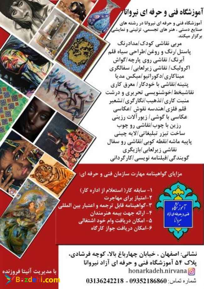 آموزشگاه فنی و حرفه ای نیروانا(ویژه تمام سنین در رشته های هنری با ارائه مدرک بین المللی) آموزشگاه فنی و حرفه ای نیروانا در تمامی رشته های هنر های تجسمی، هنرهای نمایشی، صنایع دستی ،خدمات آموزشی ،امورمالی و بازرگانی برگزار میکند همراه با مدرک بین المللی. تلفن همراه :09352186860 تلفن ثابت :03136242218 نام و نام خانوادگی آنیتا فروزنده نام واحد تجاری آموزشگاه فنی و حرفه ای نیروانا استان اصفهان امکانات کارت خوان, مشاوره رایگان, فضای باز, مناسب برای کودکان ایمیل این آدرس ایمیل توسط spambots حفاظت می شود. برای دیدن شما نیاز به جاوا اسکریپت دارید آدرس سایت: http://www.nirvanaartacademy.com/ اینستاگرام: http://instagram.com/honarkadeh.nirvana آدرس : اصفهان خیابان چهارباغ بالاروبرو مجتمع اوسان کوچه فرشاد پلاک 54 ————————————————————————————————————– آموزش نقاشی فن بیان گویندگی آموزش بازیگری صنایع دستی آموزش مدادرنگ تئاتر سینما آموزش پاستل ارائه مدرک بین المللی آموزش پاستل گچی آموزش رنگ وروغن آموزش سیاه قلم گویندگی میناکاری ویترای آموزش دکوراتیو پتینه آبرنگ نقاش با خودکار تذهیب نگارگری خوشنویسی تحریری خوشنویسی درشت عکاسی نقطه کوبی هندسه نقوش عکاسی با گوشی اکرولیک تشعیر نقاشیی کودک قلم فلزی نقاشیخط میکس مدیا نقاشی رو سفال نقاشی زیرلعابی نقاشی گواش سفارش فنی و حرفه ای نقاشی دیجیتال آنیتا فروزنده آموزشگاه نیروانا نقاشی روی پارچه بازیگری پروژه سینما آموزش بازیگری مدیریت ارتباطات مدیریت استرس مدیربازاریابی وفروش مدیرارشد کسب و کارمدیریت برندارتقایابی واحدهای صنفی مدیرتبلیغاتی وبازاریابی مدیریت ارتباط با مشتری مسئول فروش توسعه بهبود کسب وکار راه انذازی کسب و کار کارآفرینی کسب و کار به کارپیری هوش مالی مدیرآموزش پداگوژی مدیریت زمان سخنرانی حرفه ای کارشناس آموزش خلاقیت و نوآوری ابزار نقاشی دیجیتال اموزش تابلو شکست نور اموزش تابلوهای مدرن اموزش نقاشی به کودکان ۴ساله انواع هنرهای تجسمی آموزش تابلو پتینه آموزش صفر تا صد تابلو دکوراتیو آموزش عکاسی با گوشی سامسونگ آموزش عکاسی با موبایل آموزش عکاسی با موبایل آپارات آموزش عکاسی با موبایل در خانه آموزش مجازی نقاشی با مداد رنگی آموزش نقاشی با مداد رنگی pdf آموزش نقاشی با مداد رنگی جلسه اول آموزش نقاشی با مداد رنگی ساده آموزش نقاشی به کودکان 7 ساله آموزش نقاشی دکوراتیو روی بوم آموزش نقاشی دکوراتیو روی دیوار آموزش نقاشی دیجیتالی با گوشی بدون قلم آموزش نقاشی دیجیتالی با لپ تاپ آموزش نقاشی ساده و زیبا آموزش نقاشی کودکان دانلود کتاب آموزش گام به گام نقاشی با مداد رنگی دوره آموزش عکاسی با موبایل ژست عکاسی با گوشی دخترانه طراحی روشن مداد رنگی طرح خام برای تابلو دکوراتیو عکس هنرهای تجسمی فیلم آموزش عکاسی حرفه ای با موبایل فیلم نقاشی جدید قیمت نقاشی دیجیتال کانال آموزش نقاشی با مداد رنگی کتاب هنرهای تجسمی معرق کاری اسم موسسه هنرهای تجسمی نقاشی با مداد رنگی طبیعت نقاشی دکوراتیو گل نقاشی دیجیتال آنلاین نقاشی دیجیتال با قلم نوری نقاشی دیجیتال با گوشی نقاشی دیجیتال فانتزی نقاشی ساده نقاشی کودکانه آپارات نقاشی ها هنر های تجسمی چیست هفتم هنرهای تجسمی به انگلیسی هنرهای تجسمی چیست هنرهای غیر تجسمی وسایل عکاسی با گوشی شتاب