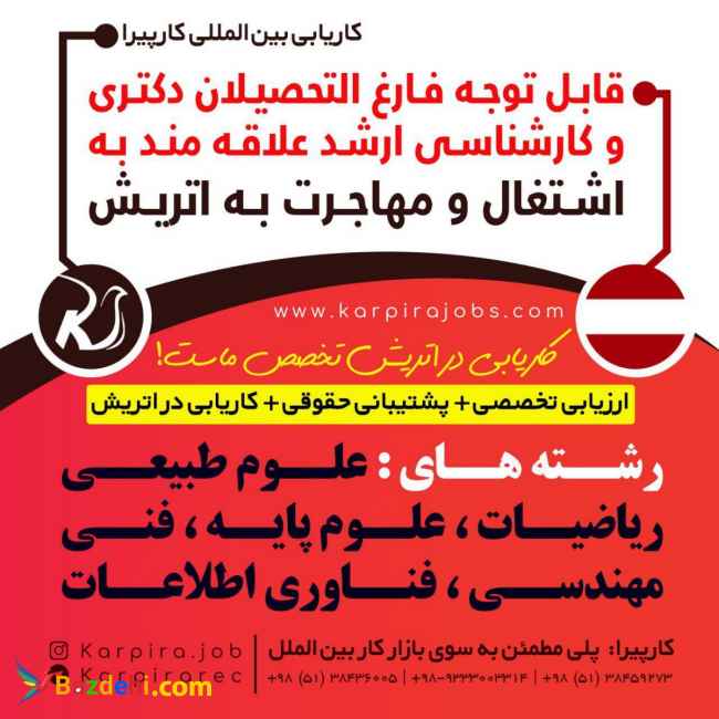 کاریابی بین المللی کارپیرا قابل توجه فارغ التحصیلان دکتری و کارشناسی ارشد علاقه مند به اشتغال و مهاجرت به اتریش رشته های علوم طبیعی، ریاضیات، علوم پایه، فنی مهندسی، فناوری اطلاعات کاریابی در اتریش تخصص ماست! ارزیابی تخصصی + پشتیبانی حقوقی + کاریابی در اتریش +98 (51) 38436005 & +98-9333003314 & +98 (51) 38459273 کارپیرا: پلی مطمئن به سوی بازار کار بین الملل