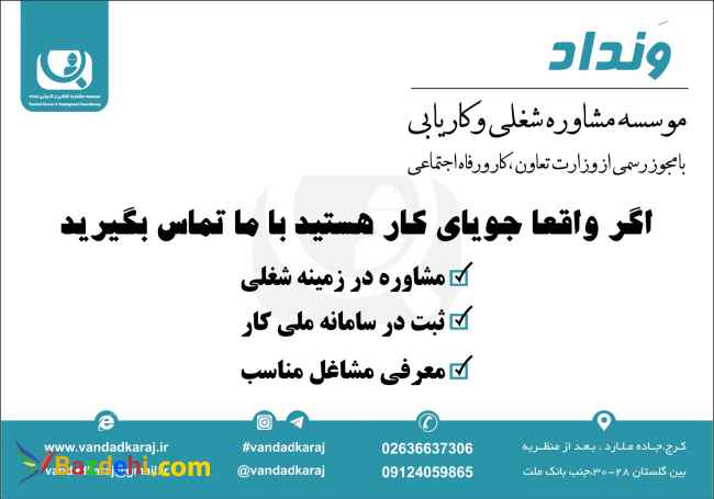 موسسه مشاوره شغلی و کاریابی ونداد با هدف تامین نیروی شایسته و کارآمد و بانک اطلاعاتی کاملی از کارجویان، فعال در استخدام و کاريابي در استان البرز و سراسر کرج آماده ارایه خدمات در این خصوص میباشد.