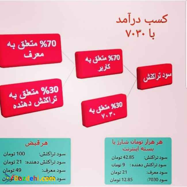 شما با نصب و فعالسازی اپلیکیشن 7030 از طریق: بازار،گوگل پلی،اپ استور وسایت ۷۰۳۰،و با انجام کارهایی مثل خرید شارژ،بسته اینترنتی،پرداخت قبض و خدمات بانکی که همیشه انجام میدهید و معرفی این سامانه به دیگران سود مشخص بدست آورید