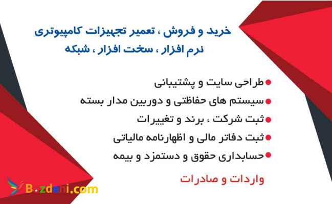 شرکت با موضوع گسترده و کلی از بخشهای پیمانکاری ، سیستمهای الکترونیکی ، کامپیوتری و شبکه و مخابراتی و IT ،شیمی و بهداشتی و آزمایشگاهی، امورات حسابداری وخدماتی و اداری (ثبت شرکت و برند وتغییرات) ...
