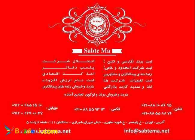 موسسه حقوقی ثبت ما ارائه دهنده خدمات مشاوره ثبت شرکت و ثبت برند ، اخذ و تمدید رتبه پیمانکاران ، اخذ و تمدید کارت بازرگانی حقیقی و حقوقی ، کلیه تغییرات شرکتها , انحلال شرکت , پلمپ دفاتر , اخذ کد اقتصادی و طراحی و پشتیبانی سایت می باشد. این مجموعه با توجه به 14 سال سابقه و داشتن مشاورین با تجربه و وکلای مجرب در این زمینه ... در ارائه خدمات بهتر و سریعتر همراه با هزینه کمتر برای موکلین خود دارد. برای تسهیل در انجام امور موکلین، مشاورین حقوقی ثبت ما به صورت شبانه روزی (تلفنی و اینترنتی) و در ساعات اداری جهت مشاوره به صورت حضوری پاسخگوی شما عزیزان می باشند. آدرس شركت ثبت ما را اعلام ميدارم ، خيابان وليعصر خيابان استاد مطهري نبش ميرزاي شيرازي پلاك 211 ساختمان 111 طبقه 2 واحد 5 با پاركينگ مجزا جهت ميهمانان گرامي