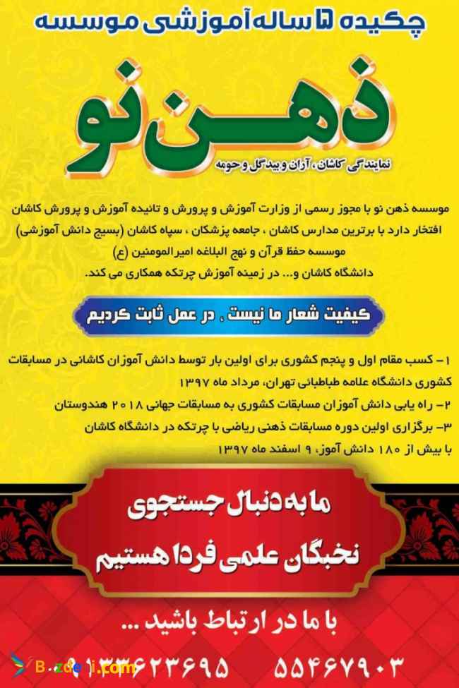 کاشان سه راه غزنوی جنب دوچرخه فروشی امینی طبقه دوم موسسه ذهن نو