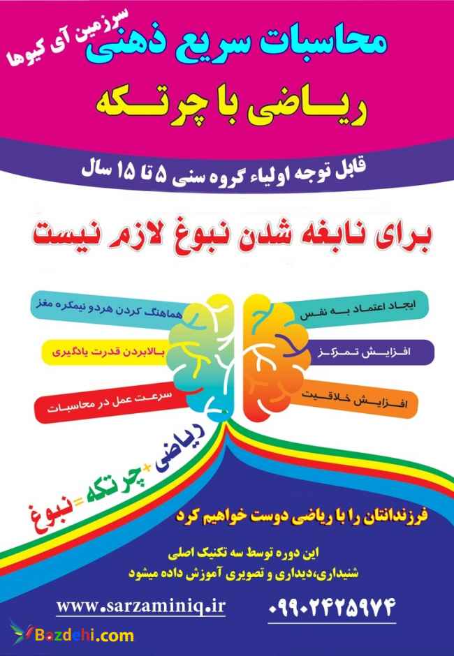 گروه آموزشی سرزمین آی کیوها واقع در شهر اصفهان و فعال در زمینه آموزش کودک و نوجوان از همه ی علاقه مندان به تدریس و آموزش از سراسر کشور دعوت به همکاری می کند. برگزاری دوره و کارگاه های آموزش دوره های مربیگری : -محاسبات ذهنی چرتکه - رباتیک مقدماتی و پیشرفته -مکانیک کوچولو و مهندسی خلاقیت همراه با اعطای کارت مربیگری معتبر و معرفی به بازار کار آم مجری برگزاری دوره های دانش آموزی در مدارس و مراکز فرهنگی در اصفهان با شرایط ویژه فروش ویژه پک های رباتیک قطعات و لوازمات جانبی پک های آموزش چرتکه فروش انواع بازی های فکری ، کمک آموزشی در اصفهان 09902425974 www.sarzaminiq.ir