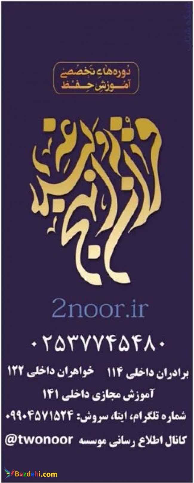 ثبت نام دوره های حضوری و مجازی موسسه قرآن و نهج البلاغه 1- دوره های آموزش تخصصی حفظ قرآن کریم (به دو صورت حضوری و غیر حضوری یا تلفنی) 2- دوره های آموزش تخصصی حفظ نهج البلاغه (به دو صورت حضوری و غیر حضوری یا تلفنی) 3- دوره های آمادگی کنکور کارشناسی ارشد رشتۀ علوم قرآن و حدیث ویژه حافظان قرآن کریم 4- برگزاری کلاسهای فشرده تست زنی کنکور 5- تهیه منابع کنکور کارشناسی ارشد (13 کتاب و جزوه+ 110 جلسه آموزش مجازی + 21 جلسه آموزش تست زنی) 6- برگزاری همه کلاسها به صورت حضوری، یا مجازی (آنلاین و آفلاین) 7- برگزاری مسابقات ملی حفظ و مفاهیم نهج البلاغه 8- برگزاری مسابقات کتابخوانی مفاهیم نهج البلاغه (راه روشن) 9- مدرسه هنر تلاو ت: آموزش مجازی (آنلاین و آفلاین) در رشته های روخوانی، تجوید، صوت ولحن، قرائت قرآن و ترتیل خوانی با سبک آموزشی نوین و محتوای مخصوص، برای قرآن آموزان موسسات قرآنی کشور و همه علاقه مندان داخل و خارج کشور برای اطلاعات بیشتر به؛ آدرس قم خ صفائیه کوچه 34 پ4 تلفن: 02537745480 آموزش خواهران داخلی 122 آموزش برادران داخلی 114 آموزش مجازی داخلی 141 شماره واتساب استاد برای دوره های مدرسه هنر تلاوت: 09904571524 هماهنگی دوره های کنکور ارشد: 09121511973 سایت: www.2noor.ir , www.2noor.com ایمیل:این آدرس ایمیل توسط spambots حفاظت می شود. برای دیدن شما نیاز به جاوا اسکریپت دارید فرم های ثبت نام آنلاین موسسه دوره های موسسه: http://2noor-reg.ir/ کانال مدرسه مجازی هنر تلاوت در شبکه های اجتماعی: تلگرام:https://telegram.me/honare_telavat ایتا:https://eitaa.com/honare_telavat سروش:https://what.sapp.ir/honare_telavat آپارات:https://www.aparat.com/qurannahj/playlists کانال اطلاع رسانی موسسه قرآن و نهج البلاغه در شبکه های اجتماعی: تلگرام:https://t.me/twonoor ایتا:https://eitaa.com/twonoor دوره های عمومی دوره های تخصصی ثبت نام دوره های حفظ قرآن کریم ثبت نام دوره های حفظ نهج البلاغه کلاس آمادگی کنکور کارشناسی ارشد رشته علوم قرآن و حدیث حافظان قرآن حفظ قرآن حفظ نهج البلاغه کلاس های فشرده تست زنی منابع کنکور کارشناسی و کارشناسی ارشد کلاس های حضوری قرآن کلاس های غیرحضوری قرآن حفظ تلفنی قرآن کلاس مجازی آنلاین مسابقه ملی حفظ نهج البلاغه مسابقه کتابخوانی راه روشن آموزش قرائت آموزش تجوید آموزش صوت ولحن آموزش ترتیل خوانی روخوانی و روانخوانی مدرسه مجازی هنر تلاوت موسسه قرآن موسسه نهج البلاغه سفر زمینی کربلا سفر هوایی کربلا برای اطلاعات بیشتر به؛ آدرس قم خ صفائیه کوچه 34 پ4 تلفن: 02537745480 آموزش خواهران داخلی 122 آموزش برادران داخلی 114 آموزش مجازی داخلی 141 شماره واتساب استاد برای دوره های مدرسه هنر تلاوت: 09904571524 هماهنگی دوره های کنکور ارشد: 09121511973 سایت: www.2noor.ir , www.2noor.com ایمیل:این آدرس ایمیل توسط spambots حفاظت می شود. برای دیدن شما نیاز به جاوا اسکریپت دارید