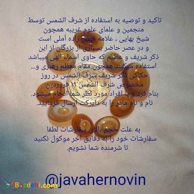 ثبت نام حکاکی دعای شرف شمس روی عقیق زرد به نام خودتان در روز ۱۹ فروردین از خواص دعای شرف میتوان به افزایش رزق و روزی و دفع چشم زخم و مشکل گشایی و ... اشاره کرد. شرکت جواهرنوین افتخار دارد هرساله این دعای پربرکت را برای دوستان علاقمند حکاکی کند. امسال میز دعا را با رعایت کامل آداب و شرایط انجام خواهیم داد. دوستان خواهان این نگین و دعا با ما تماس بگیرند.
