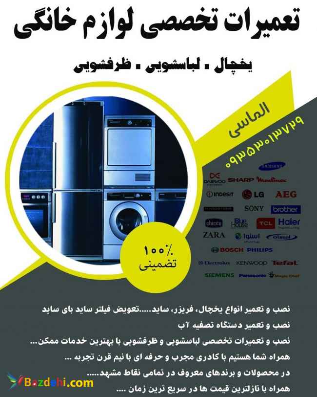 تعمیرات تخصصی لباسشویی اتومات و ظرفشویی و یخچال نصب انواع یخچال.فریزر.ساید.....تعویض فیلتر ساید....نصب دستگاه تصفیه آب.... نصب و تعمیر تخصصی لباسشویی اتومات و ظرفشویی با بهترین خدمات ...در محصولات و برندهای معروف در تمامی نقاط مشهد.....خدمات در تمامی نقاط مشهد در سریع ترین وقت ممکن...همراه با نازلترین قیمتها....هدف ما جلب اعتماد و فراهم کردن آرامش و آسایش برای شماست....قابل ذکر است تمامی تعمیرات جهت رفاه و اعتماد شما و صرفه در هزینه در محل انجام میشود... 09353013729. الماسی