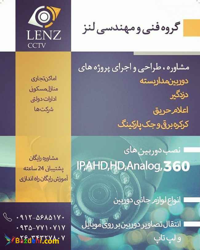 گروه فنی و مهندسی لنز در خدمت شما همشهریان گرامی است: *نصب دوربین مدار بسته* دزدگیر اماکن اعلام حریق برق کشی اماکن صنعتی،تجاری و مسکونی تمامی خدمات فوق توسط افراد مجرب و فنی اجرا میگردد. *امنیت را به شما هدیه میدهیم* 09125685170 09357710717 02634327807