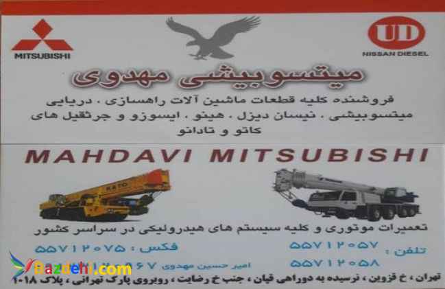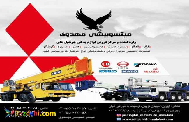 خرید لوازم یدکی جرثقیل فروشنده ماشین الات راهسازی تعمیرات سیستم های هیدرولیکی فروش ماشین الات موتوری و هیدرولیکی فروشگاه میتسوبیشی مهدوی با سابقه درخشان در زمینه واردات لوازم یدکی جرثقیل در نظر دارد با اجناس با کیفیت و اورجینال رضایت شما مشتریان عزیز را جلب نماید و نگرانی شما برای خرید لوازم یدکی و تعمیرات تخصصی را برطرف نماید. فروشگاه میتسوبیشی مهدوی مرکز فروش محصولات کاتو تادانو نیساندیزل میتسوبیشی هینو ایسوزو کوبلکو می باشد همچنین تعمیرات تخصصی موتوری، برقی،هیدرولیکی انواع جرثقیل ها در سراسر کشور با کارکنان مجرب و متخصص حرفه ماست . با فروشگاه ما دیگر نگران خرید قطعات ماشین الات خود نباشید. چون هدف ما کیفیت و شعار ما رضایتمندی شماست. راه های ارتباطی ادرس:تهران،خ قزوین، نرسیده به دوراهی قپان،روبروی پارک تهرانی، پلاک۱۰۱۸ شماره تماس: ۰۲۱۵۵۷۱۲۰۵۷ ۰۲۱۵۵۷۱۲۰۵۸ فکس:۰۲۱۵۵۷۱۲۰۷۵ همراه: ۰۹۱۲۱۰۱۲۲۱۸ با مدیریت امیر حسین مهدوی