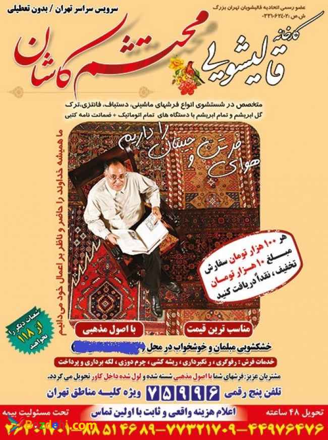 قالی شویی محتشم کاشان متخصص در شستشوی انواع فرشهای ماشینی، دستباف، فانتزی،ترک، گل ابریشم و تمام ابریشم با دستگاه های تمام اتوماتیک + ضمانت نامه کتبی+سرویس دهی به کل تهران