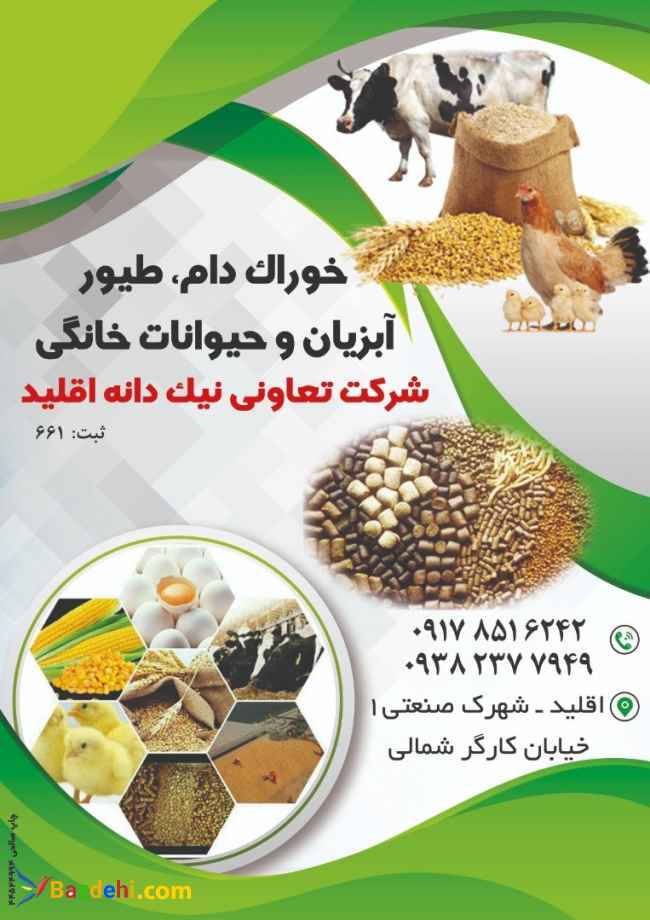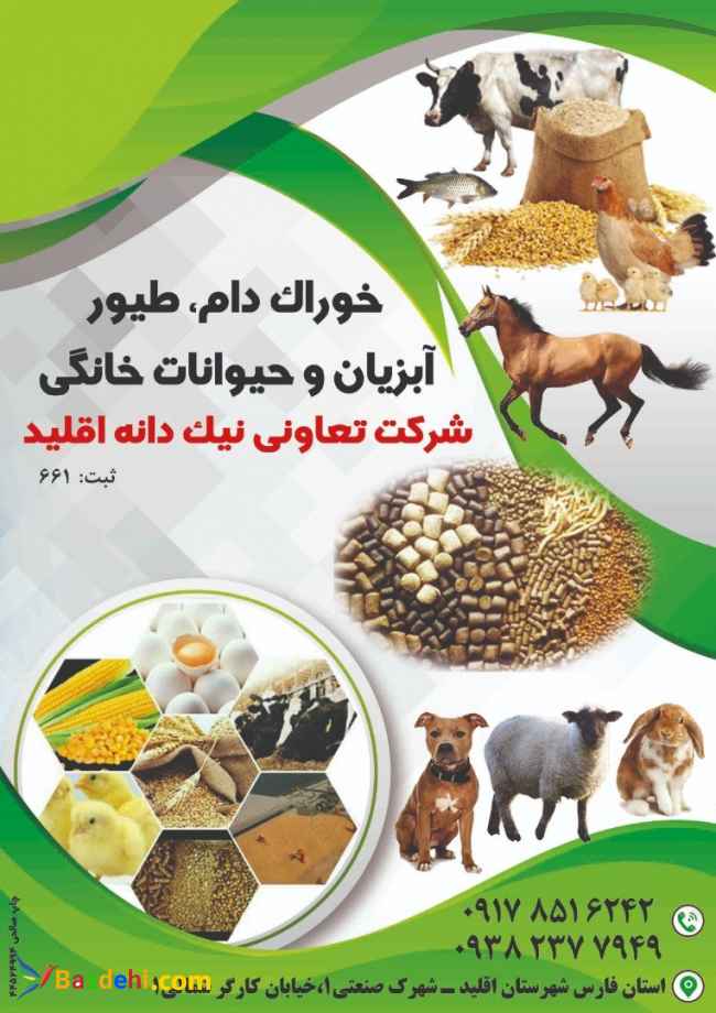 کارخانه نیک دانه تولید کننده خوراک دام ،طیور ،ابزیان حیوانات خانگی (سگ.گربه.خرگوش.و....) ???????،،شمار تماس 09178516242 09382377949 نماینده فروش هم میپذیریم.باتشکر