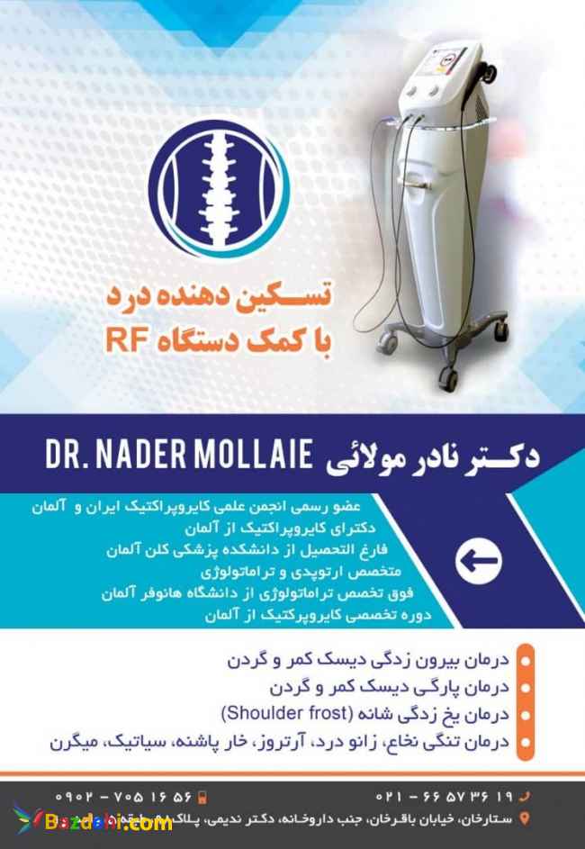 دکتر نادر مولائی درمان فتق دیسک های کمری و گردنی،زانو درد،آرتروز زانو،لیزر درمانی فارغ التحصیل از دانشکده پزشکی کلن آلمان متخصص ارتوپدی و تراماتولوژی فوق تخصص تراماتولوژی از دانشگاه هانوفر آلمان دوره تخصصی کایروپرکتیک از آلمان