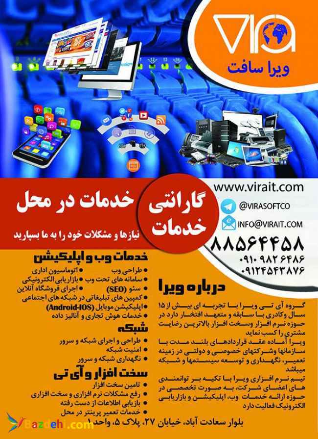 شرکت ویرا متعهد است مشکلات و نیازهای کامپیوتری سخت افزاری و نرم افزاری شما را در کوتاهترین بازه زمانی و مناسبترین قیمت برطرف نماید.همچنین این شرکت با بهره گیری از نیروهای متخصص در راستای طراحی سایت و شبکه و همچنین انجام امور تخصصی از جمله سئو (ٍُSEO) و طراحی و ساخت اپلیکیشن فعالیت مینماید