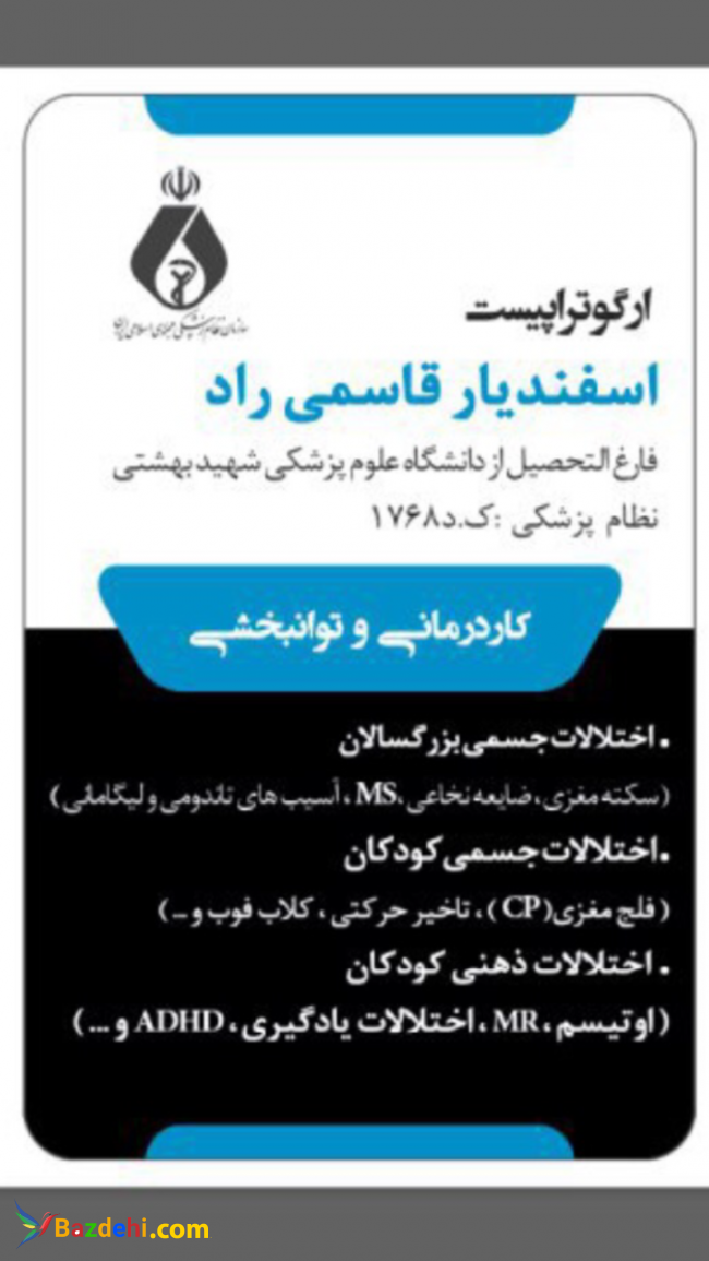ارائه خدمات كاردرماني در زمينه جسمي/ذهني،كودكان/بزرگسال،منزل/كلينيك "تحت نظر فارغ التحصيل دانشگاه علوم پزشكي شهيد بهشتي تهران "كاردرماني تخصصي سكته مغزي،فلج مغزي و ...