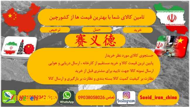 وارد کننده محصولات شما از کشور چین و دوبی و عراق (تیم بازرگانی ماروامتحان کنید) خرید ( از کارخانه یا تولیدکننده با قیمت مناسب ) درضمن نگران خرید نباشید باپول یوان ما توی چین خرید کنید حمل ( هوایی و دریایی ) ترخیص بازرسی کالا (تیم ما در چین بابزرسی خوداطمینان رابه شمامیدهند) بازرسی اعم از شمارش کالا + صحت و درستی کالا +پلمپ و ارسال کالا نمونه کالا به مشتری (برای اطمینان از کالانمونه2هفته ای به دست مشتری) گرفتن قیمت رایگان هر نوع کالایی از چین مذاکره با فرد چینی ( باتیم فارق التحصیلات چینی زبان ما ) عقدقرارداد مابین شما و چین و هرآنچه بخواهید برای واردات و صادرات
