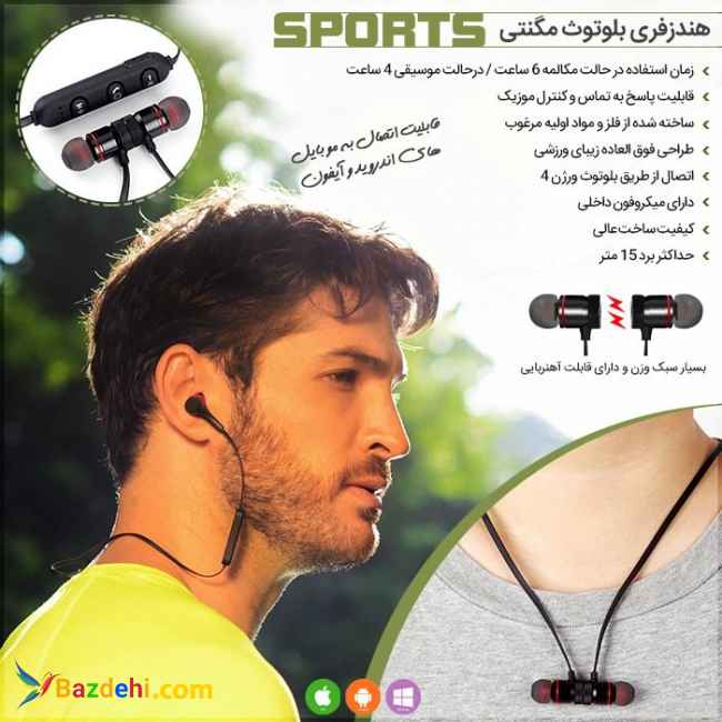 ویژگی های هندزفری بلوتوث مگنتی Sports :- زمان استفاده در حالت مکالمه 2 ساعت / درحالت موسیقی 3 ساعت - قابلیت اتصال به موبایل های اندروید و آیفون- بسیار سبک وزن و دارای قابلت آهنربایی- قابلیت پاسخ به تماس و کنترل موزیک- ساخته شده از فلز و مواد اولیه مرغوب- طراحی فوق العاده زیبای ورزشی- اتصال از طریق بلوتوث ورژن 4- دارای میکروفون داخلی- کیفیت ساخت عالی- حداکثر برد 15 متریکی از مزیتهای بسیار جالب هندزفری بلوتوث مگنتی Sports خاصیت مغناطیسی محصول است به طوریکه گوشیها در قسمت پشتی امکام اتصال به هم را دارا میباشند، در صورت عدم استفاده می توانید مانند گردنبند دور گردن خود قرار دهید. این امر باعث آسودگی در حمل و نگهداری هندزفری بلوتوث مگنتی Sports میباشد.پرداخت وجه درب منزلخرید فقط به صورت پستیارسال محصول به کل کشوربرای ثبت سفارش کدمحصول ۱۱۶۶ رابه شماره همراه من پیامک کنید تا همکاران ما در اسرع وقت با شما تماس بگیرند