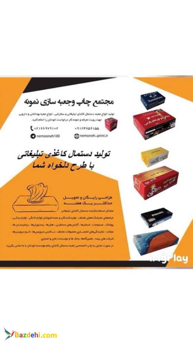 مجموعه طراحی ، چاپ و سلولوزی نمونه با تجربه 20 ساله ، متخصص ترین مرکز تولید و عرضه انواع دستمال کاغذی تبلیغاتی و اختصاصی و عمومی می باشد ، سفارش شما حداکثر ظرف مدت یک هفته با بهترین کیفیت تولید و تحویل خواهد شد . دستمال کاغذی های تبلیغاتی میتواند بعنوان بهترین هدیه قابل نمایش برای معرفی هتل ها ، کارواش ها ، تعویض روغنی ها ، بیمارستان ها ، شرکت های بیمه ، خودروسازها و شرکت های مختلف باشد . جهت رویت نمونه تولیدات به وب سایت www. Nemoneh-print.ir و یا کانال اینستاگرام nemooneh.print برای تعرفه درخواست به کانال تلگرام پیام بفرستید @nemooneh100 آدرس : تهران _ تقاطع جمهوری و ولیعصر -جنب فروشگاه رفاه - پلاک 751 تلفن ثابت1 : 66979102 تلفن .ثابت2 : 66979105 فکس : 66976574 همراه : 09124759155 سایت : nemoneh-print.ir کانال تلگرام: nemooneh100@ کانال اینستا گرام: nemooneh. Print ********* تولید انواع دستمال عرضه انواع دستمال تولید انواع دستمال کاغذی عرضه انواع دستمال کاغذی دستمال تبلیغاتی دستمال کاغذی تبلیغاتی سفارش دستمال تبلیغاتی عرضه دستمال کاغذی تبلیغاتی تولید اتواع جعبه عرضه انواع جعبه تولید جعبه تبلیغاتی سفارش انواع دستمال سفارش انواع جعبه تولید دستمال با طرح دلخواه تولید دستمال تبلیغاتی با طرح دلخواه تولید دستمال کاغذی با طرح دلخواه دستمال کاغذی های تبلیغاتی تبلیغات دستمال کاغذی تبلیغاتی دستمال کاغذی اختصاصی دستمال کاغذی سفارشی دستمال کاغذی جعبه دستمال کاغذی فروش جعبه دستمال کاغذی تولید انواع جعبه دستمال دلسی دستمال دوقلو تیشو فله
