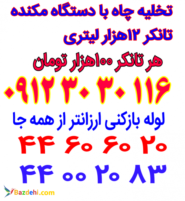 لوله بازکنی بدون خرابی حتی لولهای سخت مثل سیمان و قیر تخلیه چاه با دستگاه مکنده بدون خرابی درب چاه با تانکر ۱۲هزار لیتری لوله کشی تشخیص درآوردن اشیا از فاضلاب مثل کوشی و طلا وغیره بدون واسطه سراسر تهران /09123030116_ /09126090769_ /44606020_ /44002083_ /55765060_ /66898020_