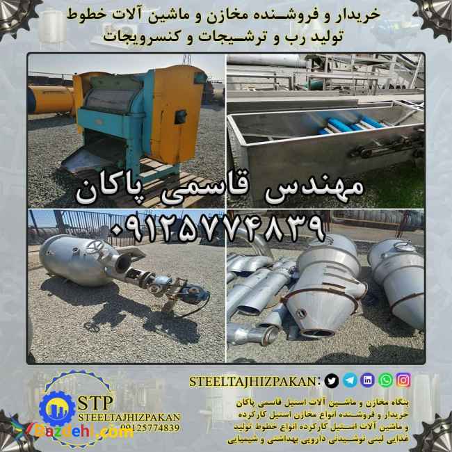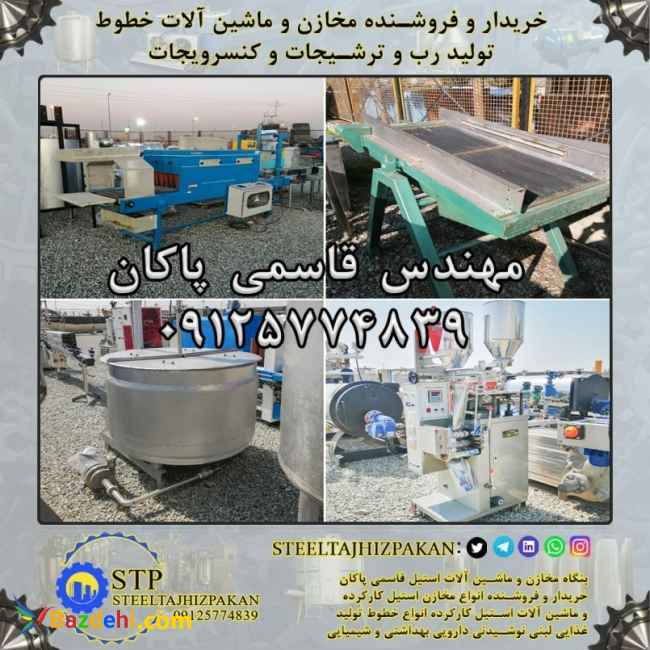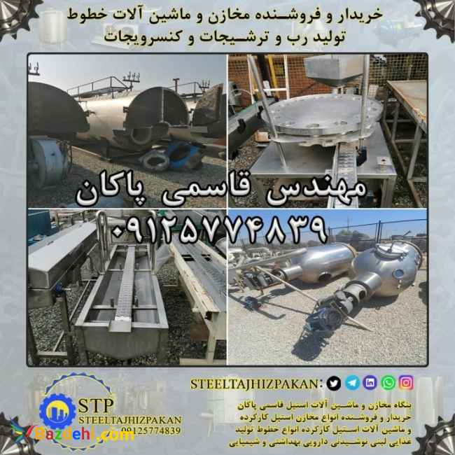 خریدار و فروشنده خطوط تولید رب / سس / مربا / کنسرویجات شامل : مخزن استیل کارکرده تک جدار ، دوجدار و سه جدار مخازن نگهداری استیل 304 وان دریافت گوجه سورتینگ شستشوی میوه منو پمپ کراشر / خرد کن / پوست گیر / هسته درار / خمیر گیر پری هیتر / مبدل کندانسور صافی دو مرحله دیگ پخت تحت خلا بلانچرمارپیچی حرارتی پاتیل گردان / پاتیل دوجدار اتوکلاو عمودی / فلزی بج تحت خلا / کانتینیوس محلول ساز شربت ساز محلول ریز پرکن خطی و روتاری دربند پدالی / تک هد / چهارهد قوطی شیشه تونل پاستور لیبل زن قوطی / شیشه غلاف زن تونل اگزاست هلیس ماردون بالابر نوار نقاله / کانوایر شیرینگ پک و همچنین خریدار و فروشنده انواع مخزن استیل و ماشین آلات استیل کارکرده و دست دوم خطوط کارخانجات لبنی ، نوشیدنی ، غذایی ، دارویی ، آرایشی و بهداشتی ، شیمیایی در سراسر ایران مهندس قاسمی پاکان 09125774839 (بنگاه مخازن و ماشین آلات استیل قاسمی پاکان)(استیل تجهیز پاکان) (((مخازن استیل تجهیزات و ماشین آلات استیل لبنی نوشیدنی غذایی دارویی آرایشی بهداشتی شیمیایی جهت بازدید موجود میباشد)))
