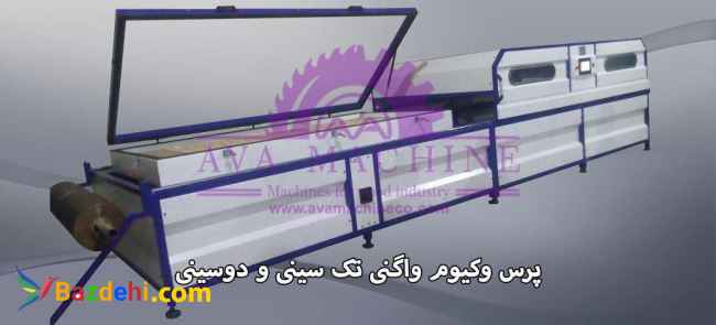 آوا ماشين البرز طراح و توليدکننده ماشين آلات صنایع چوب پرس وکیوم برای روکش کردن درب های چوبی hdf و cnc شده وقطعات چوب و mdf حکاکی شده مورد استفاده قرار میگیرد. روش کار آن با گرم کردن لایه روکش و سپس چسباندن آن بوسیله ایجاد خلاء میباشد. سیستم گرمایش دستگاه بوسیله المنتهای تابشی انجام میگیرد که این نوع المنتها به دلیل سرعت زیاد در گرم شدن، مصرف برق دستگاه را به حداقل میرساند. دستگاه دارای سیستم چروک گیر و سیستم کنترل فشار برای هرچه بهتر شدن کیفیت محصول میباشد. دستگاه دارای سرعت کار مناسب بوده وبه طور میانگین هر 3 دقیقه یکبار قادر به انجام عملیات وکیوم میباشد. موارد استفاده دستگاه وکیوم: 1_ روکش PVC 2_ روکش چرمی 3_ روکش کاغذی 4_ روکش طبیعی دستگاه در ابعاد مختلف به انتخاب مشتری و به صورت تک میز و دومیز تولید میشود. ابعاد کلی :500*160*150 سانتیمتر ابعاد میز 240*120 سانتیمتر (به سفارش مشتری) ارتفاع میز کار :6 سانتیمتر