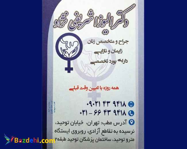 متخصص زنان در میدان آزادی دکتر الیوزا شریفی نژاد جراح و متخصص زنان ،زایمان و نازایی دارای بورد تخصصی از دانشگاه علوم پزشکی ایران آدرس مطب:تهران،خیابان توحید، نرسیده به تقاطع آزادی، روبروی ایستگاه مترو توحید، ساختمان پزشکان توحید، طبقه دوم تلفن: 66439418-021 09021439418 همه روزه،به جز ایام تعطیل با تعیین وقت قبلی عملکرد طبیعی هورمون ها در بدن یک فاکتور اساسی برای باردار شدن است . شایع ترین عامل بر هم ریختن عملکرد طبیعی هورمونـ ، پیـری است . صحبــت های زیادی که در مورد (( ساعت بیولوژیکی )) شده اســت همگی حقیقت دارند .