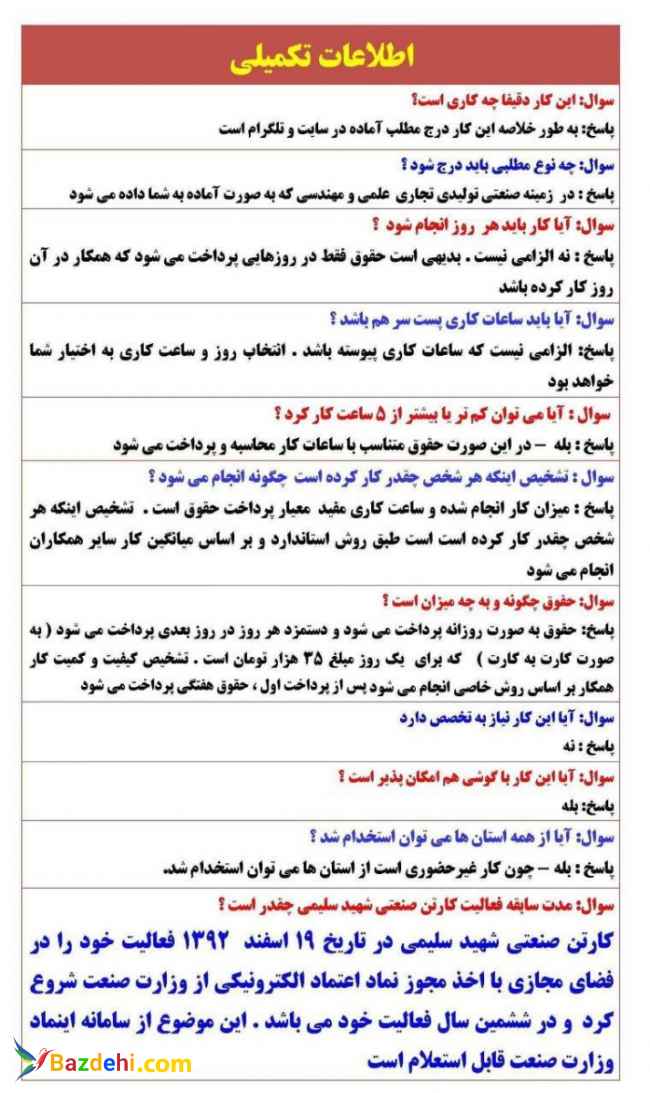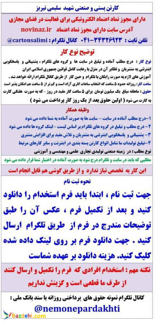 استخدام اینترنتی به صورت قانونی به تعدادی نیروی فعال در اینترنت جهت کار پاره وقت با درآمد خوب بدون و سرمایه نیازمندیم. ثبت نام انلاین کاملا واقعی و تضمینی فرصتی مناسب برای همه افراد فعالیت به صورت پاره وقت ✅بدون نیاز به تخصص ✅بدون نیاز به تحصیلات بالا ✅بدون محدودیت سنی ✅درامد راحت و آسان در منزل ✅نه نیاز به ریالی سرمایه ✅نه نیاز به جایی رفتن امکان فعالیت بیشتروافزایش درامددرطول روز امکان پرداخت هزینه اینترنت بعدازیک ماه فعالیت مفید یک شرکت معتبر وکاملا قانونی ، دارای مجوز نماد اعتماد الکترونیکی از وزارت صنعت ✅امکان درامد انلاین متناسب با فعالیت اطلاعات بیشتر و اموزش رایگان ازطریق تلگرام است وامکان پرداخت دستمزدبه صورت انلاین جهت کسب اطلاعات بیشتر در تلگرام پیام بدهید ایدی: @khanoome_khaaas