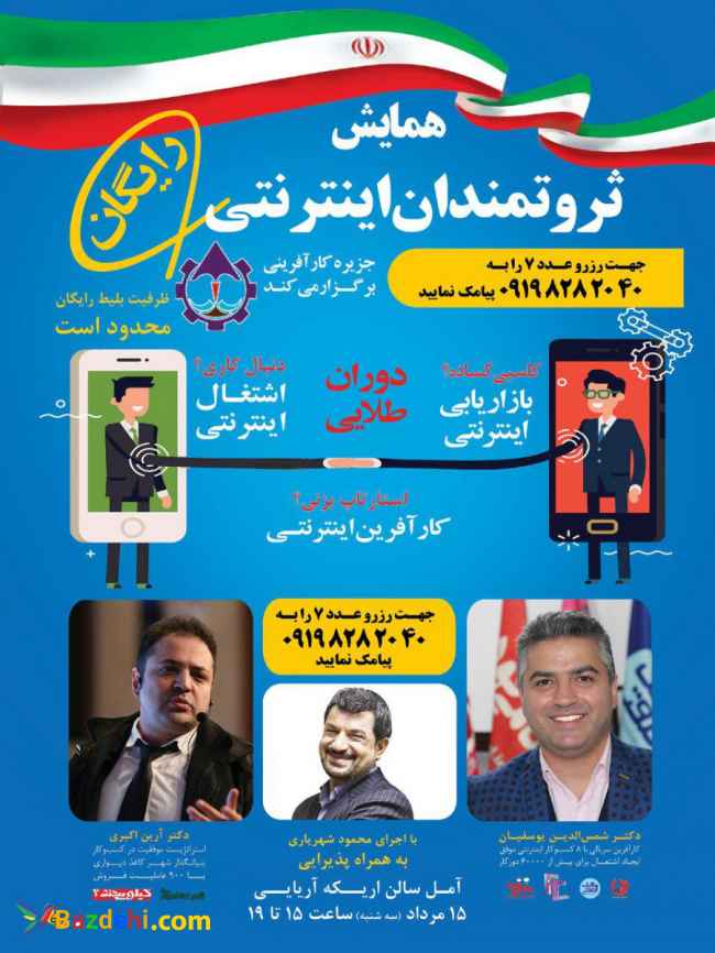 محور های همایش: • اشتغال اینترنتی • بازاریابی اینترنتی • کارآفرینی اینترنتی محل برگزاری: آمل، سالن اریکه آریایی تاریخ برگزاری: 15 مرداد 1398، ساعت 15 تا 19 جهت رزرو عدد 7 را به 09198282040 پیامک نمایید با شرکت در این همایش مسیر زندگی ثروتمندان اینترنتی را بیاموزید این دوره برای چه کسانی مناسب هست؟ • صاحب کسب و کار سنتی یا اینترنتی • بیکارها • کسی که بازارش کساده و به فکر ارتقای فروش هست • دانشجوی بیکار • کارمندی که دنبال شغل دوم هست • اونهایی که میخان از منزل خودشون کاسبی کنن (دور کاری) • مدیر فروش، پرسنل فروش و روابط عمومی • کسی که به فکر راه • اندازی کسب و کار اینترنتی یا استارتاپ هست • شتابدهنده ها و سرمایه گذار ها • اونهایی که دنبال بازار جدید هستن • کسانی که با تقویت مهارت های اجتماعی میخان دنیای خودشون رو عوض کنن • ایده داری و دنیال سرمایه گذار میگردی؟ • ایده داری و نمیدونی از کجا شروع کنی؟ • ایده داری و دنبال تیم میگردی؟ در پایان همایش هر تصمیمی بگیرید ما مسیر را برای موفقیت شما هموار کردیم 1. اگر بیکار هستید، در پایان همایش دیگر بیکاری برای شما معنا نخواهد داشت. 2. اگر کسب و کاری دارید به صورت تضمینی در پایان این همایش مسیر را برای فروش 10 برابری کسب و کارتان پیدا خواهید کرد. 3. اگر به فکر راه اندازی استارتاپ هستید، مسیر صفر تا صد برایتان هموار خواهد شد. محل برگزاری: آمل، سالن اریکه آریایی تاریخ برگزاری: 15 مرداد 1398، ساعت 15 تا 19 جهت رزرو عدد 7 را به 09198282040 پیامک نمایید با شرکت در این همایش مسیر زندگی ثروتمندان اینترنتی را بیاموزید دکتر شمس الدین یوسفیان (کارآفرین سریالی) سخنران همایش ثروتمندان اینترنتی 1- کارآفرین سریالی و بنیانگذار کسب و کارهای اینترنتی زیر: • رایا مارکتینگ - خدمات بازاریابی اینترنتی با رتبه 600 الکسای ایران www.rayamarketing.com • ایران تایپیست - خدمات تایپ و ترجمه www.irantypist.com • مامی فود - سفارش غذا www.mamifood.org • ارشدان - چاپ کتاب www.arshadan.net • جیب پی - فین تک www.jibpay.com • وکیل تلفنی - مشاوره حقوقی www.vakiltel.com • ژناریا - تولید حوزه بیوتکنولوژی www.genarya.com • داستانت - فروش کتاب داستان اختصاصی www.dastanet.com • 3- مولف کتاب "راهنمای کارآفرینان و سئو 2018" و مترجم کتاب های استارتاپ در 7 روز، مدرسه استارتاپ ست گودین، استارتاپ های بسیار موفق آمریکایی، استارتاپ های 100 دلاری، شش راز موفقیت استارتاپ 4- ناشر و کارشناس رسمی دادگستری در حوزه بیوتکنولوژی 5- مدرس دوره های کسب و کار اینترنتی و آموزش دیجیتال مارکتینگ 6- بنیانگذار جزیره کارآفرینی و برگزار کننده همایش ثروتمندان اینترنتی در ایران www.jk24.ir صفحه اینستاگرام دکتر شمس الدین یوسفیان www.instagram.com/shamseddinyousefian دکتر آرین اکبری سخنران همایش ثروتمندان اینترنتی 1- بنیانگذار شهر کاغذ دیواری با 900 عاملیت فروش در کشور 2- بنیانگذار موفقیت ژنتیکی و ژنتیک موفقیت (ایشان دکتری تخصصی ژنتیک دارند) 3- مدرس دوره های کوچینگ فردی و مهارتهای اجتماعی صفحه اینستاگرام دکتر آرین اکبری www.instagram.com/drarianakbari مجری محبوب: جناب آقای محمود شهریاری صفحه اینستاگرام محمود شهریاری www.instagram.com/mahmoud_shahriarii محل برگزاری: آمل، سالن اریکه آریایی تاریخ برگزاری: 15 مرداد 1398، ساعت 15 تا 19 جهت رزرو عدد 7 را به 09198282040 پیامک نمایید با شرکت در این همایش مسیر زندگی ثروتمندان اینترنتی را بیاموزید