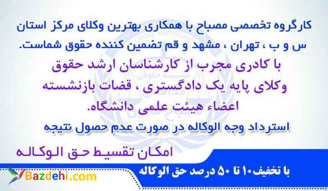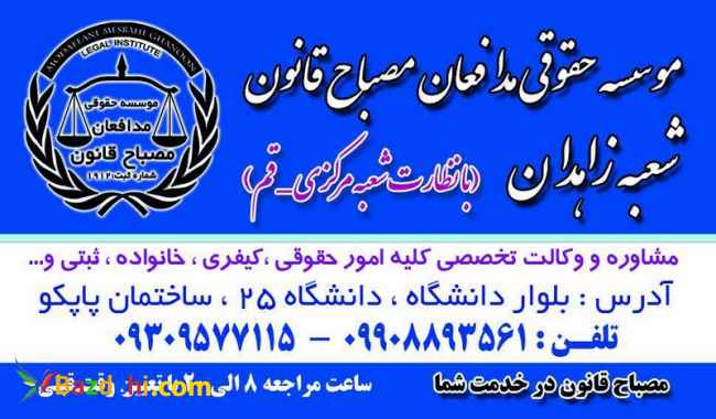 موسسه حقوقی مصباح قانون شعبه زاهدان شماره ثبت 1912 (با نظارت شعبه مرکزی قم) -با مدیریت مجرب دارای سابقه کار قضایی *با حضور وکلای برتر کشور *اعضاء هیئت علمی دانشگاه *قضات بازنشسته 1-قبول کلیه پرونده های حقوقی خانواده مهریه ،نفقه ،اجره المثل ،طلاق و... اختلافات ملکی ،اثبات مالکیت، الزام به تنظیم سند،خلع ید و... -چک و سفته بدون نیاز به حضور شما -روابط کارگری و کارفرما 2-پرونده های کیفری قتل ،آدم ربایی، کلاهبرداری ،سرقت، ضرب و شتم و... مواد مخدر... -از مرحله دادسرا تا دادگاه بدوی و تجدید نظر -دیوان عالی کشور -دیوان عدالت اداری و کلیه مراجع قضایی و شبه قضایی. مزایاو خدمات ویژه مرکز: #مشاوره رایگان #امکان تقسیط حق الوکاله #تخفیف ده تا پنجاه در صد حق الوکاله #استرداد وجه الوکاله در صورت عدم حصول نتیجه آدرس: زاهدان دانشگاه 25،ساختمان پاپکو شعبه مرکزی : قم ، خیابان صدوقی ، بلوار اخلاقی ، تقاطع مفتح ، ساختمان رایا تلفن تماس جهت مشاوره و تعیین وقت 09908893561-05433343969