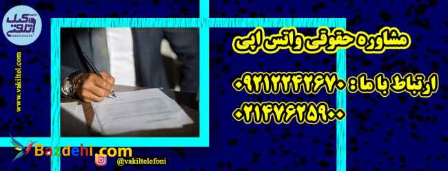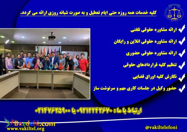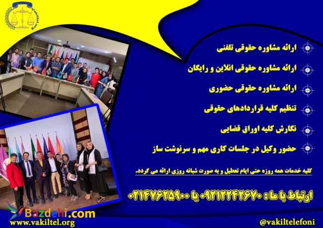 مشاوره حقوقی تلفنی 24 ساعته با وکیل پایه یک برای رزرو مشاوره حقوقی تلفنی در هر ساعتی از شبانه روز حتی روزها تعطیل میتوانید با شماره 02147625900و یا شماره 09212242670 هماهنگی نموده و وکیل دادگستری زیر پنج دقیقه در همان لحظه برای مشاوره ببا شما تماس میگیرند درخواست مشاوره حقوقی تلفنی 02147625900 هزینه مشاوره حقوقی تلفنی با وکلای دادگستری هزینه 5 دقیقه مشاوره با وکیل 20هزار تومان هزینه 10 دقیقه مشاوره با وکیل 30هزار تومان هزینه 20 دقیقه مشاوره با وکیل 60هزار تومان هزینه 30دقیقه مشاوره با وکیل 90هزار تومان هزینه 60 دقیقه مشاوره با وکیل 150هزار تومان رزرو تلفنی :09212242670 رزرو انلاین:https://vakiltel.org/Legal_chart