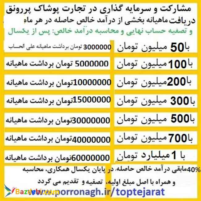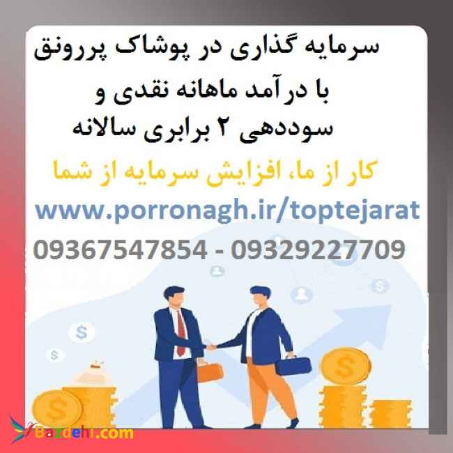 سرمایه پذیری و شراکت در کسب و کار و سرمایه گذاری در پوشاک و تولید و پخش لباس پررونق با هر مبلغی از سراسر تهران و ایران. سرمایه از شما کار از ما. شراکت در سود با سهم سود مساوی 50% برای هریک از طرفین (من و شما) که این 50 درصد سود شما، طی یکسال، تقریباً برابر با 100% تا 300% سرمایه شما و چه بسا بیشتر است. http://www.porronagh.ir/toptejarat فرصتهای سرمایه گذاری با درآمد بالا و سرمایه گذاری در تولید لباس: شراکت در سود با بازدهی بالا و درآمد بالا با هر میزان سرمایه. و دریافت نقدی ماهیانه بخشی از سود و درآمد ناخالص که در هر ماه، پرداخت میشود. یعنی معادل 5% سرمایه بعنوان درآمد ثابت و سود پیشفرض ماهیانه که مابقی درآمد خالص، حدود 30% تا 40% باقیمانده در پایان یکسال شراکت، محاسبه و تصفیه میشود. در کشور ایران و اکثر کشورهای جهان، پوشاک و لباس، در صدر لیست تقاضا و فروش و بعد از مواد غذایی، دارای رتبه دوم محصول پرفروش میباشد و یکی از کالاهای اساسی و نیاز روز مردم به شمار میرود. همینک با هدف گسترش کسب و کار و افزایش محصولات و خدمات و تنوع بخشی به اجناس و.... از شما سرمایه گذار عزیز نیز جهت سرمایه گذاری با درآمد میلیونی، دعوت به شراکت و سرمایه گذاری در کسب و کار پررونق بعمل میآورم. • سرمایه گذاری با 50 میلیون تومان • شراکت با 70 میلیون تومان • سرمایه گذاری با 80 میلیون تومان • شراکت با 100 میلیون تومان • سرمایه گذاری با 150 میلیون تومان • شراکت با 200 میلیون تومان • سرمایه گذاری با 300 میلیون تومان • شراکت با 400 میلیون تومان • سرمایه گذاری با 500 میلیون تومان • شراکت با 600 میلیون تومان • سرمایه گذاری با 700 میلیون تومان • شراکت با 800 میلیون تومان • سرمایه گذاری با 900 میلیون تومان • شراکت با 1 میلیارد تومان • سرمایه گذاری با 2 میلیارد تومان و سرمایه پذیری با هر مبلغی. قرارداد شراکت و سرمایه گذاری بین من و شما حضوری در محل یا شهر مورد نظر شما یا محضری یا آنلاین و... قابل انجام است. اعتبار این فرصت سرمایه گذاری در تولیدی و شراکت در پوشاک و دعوت به همکاری تا چه زمانی است؟ فعلاً بمدت محدود و تا زمان فعال بودن این فراخوان سرمایه گذاری و شراکت در کار، پذیره نویسی و سرمایه پذیری در تولید و پخش پوشاک انجام میشود تجارت لباس و تهیه و پخش و فروش لباس و... تمامی امور در طول شراکت، برعهده خودم است و تمامی محاسبات مالی، بصورت شفاف و برپایه مستندات و طبق قرارداد میباشد. مشاهده ویدئوی کامل این طرح سرمایه گذاری و پاسخ به تمامی سؤالات و طرح توجیهی سرمایه گذاری و... در سایت فروشگاه لباس پررونق. لطفاً جهت ارتباط بهتر، بهیچوجه از روی فرم تماس این آگهی جذب سرمایه گذار، پیام نداده این آدرس ایمیل توسط spambots حفاظت می شود. برای دیدن شما نیاز به جاوا اسکریپت دارید و این آدرس ایمیل توسط spambots حفاظت می شود. برای دیدن شما نیاز به جاوا اسکریپت دارید و مستقیماً به یک یا هر دو ایمیل فوق، پیام دهید خوشحال میشویم هنگام تماس تلفنی یا ایمیل، نام سایتی که همینک با فرصت سرمایه گذاری پررونق آشنا شده اید را نیز ذکر کنید. تماس شبانه روزی، حتی تعطیلات پخش پوشاک پررونق 09329227709 سید محمد حسینی 09367547854 بازار بزرگ تهران 02155818943 اطلاعات کاملتر و فایل قرارداد سرمایه گذاری با درآمد ثابت و شراکت و... در: www.porronagh.ir/toptejarat