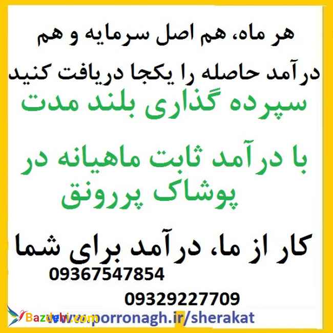 سرمایه پذیری و مشارکت مالی و سرمایه گذاری در پخش پوشاک و پخش لباس پررونق. با بازدهی و سوددهی خالص ماهانه با هر میزان سرمایه. با امکان برداشت نقدی ماهیانه بخشی از سود و درآمد که در هر ماه، پرداخت و تقدیم میشود. در کشور ایران و اکثر کشورهای جهان، پوشاک و لباس، در صدر لیست تقاضا و فروش و دارای رتبه برتر یکی از دو محصول پرفروش میباشد و یکی از نیازهای اساسی و روز مردم به شمار میرود. مرکز پخش پوشاک پررونق، صرفاً با هدف گسترش کسب و کار و افزایش محصولات و خدمات و تنوع بخشی به اجناس و.... در کنار سرمایه های خود، از دیگر سپرده گذاران نیز جهت سرمایه گذاری با درآمد میلیونی، دعوت بعمل میآورد. با سهم سود مساوی برای هریک از طرفین که تقریباً برابر با دو برابر سرمایه شما میباشد. برای مثال، با سرمایه گذاری با 20 میلیون تومان، ماهیانه 1100000 تومان دریافتی داشته و به حسابتان واریز می گردد که نیمی ازین مبلغ، بعنوان بخشی از سرمایه اصلی و نیمی دیگر بابت درآمد ماهیانه میباشد و بدینسان، طی سه سال شراکت و همکاری، هم اصل سرمایه و هم درآمد حاصله از آنرا دریافت نموده اید سرمایه اولیه(تومان) مجموع دریافتی ماهیانه سرمایه5000000 دریافتی280000 سرمایه10000000 دریافتی550000 سرمایه15000000 دریافتی850000 سرمایه20000000 دریافتی1100000 سرمایه25000000 دریافتی1400000 سرمایه30000000 دریافتی1650000 سرمایه35000000 دریافتی1950000 سرمایه40000000 دریافتی2250000 سرمایه45000000 دریافتی2500000 سرمایه50000000 دریافتی2800000 سرمایه55000000 دریافتی3050000 سرمایه60000000 دریافتی3350000 سرمایه65000000 دریافتی3600000 سرمایه70000000 دریافتی3900000 سرمایه75000000 دریافتی4150000 سرمایه80000000 دریافتی4450000 سرمایه85000000 دریافتی4700000 سرمایه90000000 دریافتی5000000 سرمایه95000000 دریافتی5300000 سرمایه100000000 دریافتی5550000 شراکت و سرمایه پذیری از 5 میلیون تومان تا 100 میلیون تومان برای هر نفر از سراسر ایران. حاصل سالها سابقه و تجربیات ما در کار پوشاک و سرمایه گذاریهای خودمان و... این بوده که هر میزان سرمایه گذاری در شغل پرسود لباس و پوشاک و کیف، سالانه سوددهی چند برابری دارد که با وجود اینکه بخشی از آن، بعنوان مالیات و هزینه های فروشگاه و جانبی و مخارج و... صرف میشود، اما همچنان مجموعاً سود چند برابری برای هر میزان سرمایه را دارد. نحوه مشارکت و شروع شراکت و سپرده پذیری؟ جهت حُسن انجام کار، قرارداد شراکت و سرمایه گذاری و سپرده پذیری بین ما و شما منعقد می گردد. برای عزیزان خارج از شهر تهران، هم امکان قرارداد حضوری در شهر و محل مورد نظر آنها و هم بصورت آنلاین مقدور است. اعتبار این طرح شراکت و سرمایه گذاری و دعوت به همکاری تا چه زمانی است؟ فعلاً بمدت محدود، پذیره نویسی و سرمایه پذیری انجام میشود و پس از آن، بدلیل پیشگیری از بوجودآمدن تداخلات مالی و عدم توان محاسبه دقیق سوددهی و بازدهی، متأسفانه امکان شراکت و سرمایه پذیری با مبلغ کم میسر نمیباشد. برای شراکت، و یا تهیه و پخش و فروش و... نیز تمامی امور از صفر تا صد برعهده گروه پررونق است و کلیه محاسبات مالی، بصورت شفاف و برپایه مستندات و طبق قرارداد میباشد. چرا هر فرد تا 100 میلیون تومان میتواند سپرده گذاری کند؟ هدف ما حمایت از سرمایه های خرد و کوچک و سپرده گذاری با مبلغ کم و سود بالا میباشد که سرمایه هایشان محفوظ مانده و بتدریج توسط خودشان خرج نشود. زیرا امکان سرمایه گذاری در بسیاری از موارد دیگر را ندارند اما برای ما مانعی ندارد. و هر میزان مبلغی، ارزشمند و قابل استفاده است. آدرس فروشگاه و انبار و رزومه و سایر اطلاعات و مشاهده ویدئوی کامل این طرح و پاسخ به تمامی سؤالات متداول و طرح توجیهی سرمایه گذاری و... در سایت فروشگاه لباس پررونق. این فروشگاه پوشاک، بدلیل حذف واسطه ها و تولید مستقیم و یا واردات بدون واسطه، با کمترین قیمت یعنی به قیمت عمده و قیمت 30 الی 50 درصد کمتر از سایر فروشگاههای پوشاک فعالیت دارد و به همین سبب یعنی ارزانی بیش از حد و کیفیت مطلوب و بالا و مد روز و... بسیار پرفروش و پرمخاطب میباشد و سوددهی کاملاً خالص با امکا