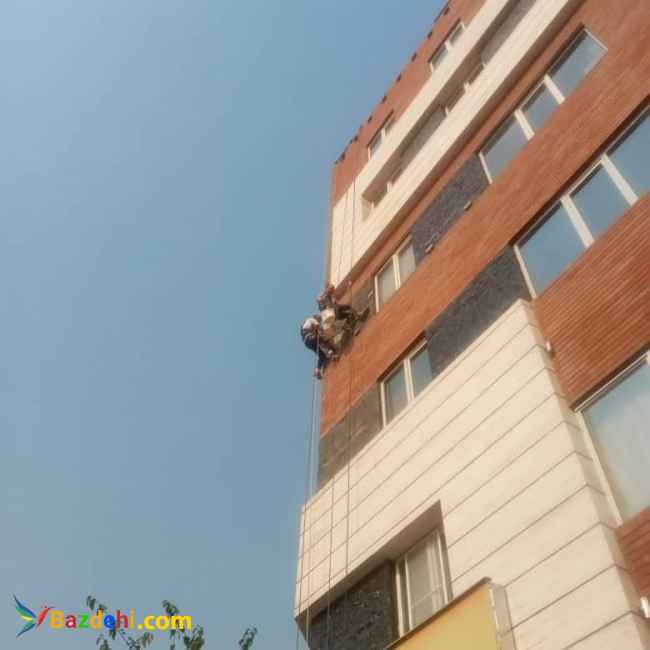 با سلام خدمت دوستان کار در ارتفاع بدون نیاز به داربست کلیه کار ها در ارتفاع انجام مشود ک شامل شسشوی نما پیچ رول پلاک آبندی و عایقکاری نورپردازی و..