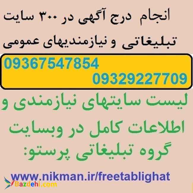 انجام درج تبلیغات در سایتهای نیازمندی فعال و معرفی کسب و کار شما و تبلیغ صنایع و مشاغل و شرکتها و برندها و کارخانجات در اینترنت و 350 سایت بانک مشاغل با هر میزان متن دلخواه تان و شماره تماس و سایت شما و درج کلمات کلیدی مجزا و بک لینک و قرار گرفتن در صفحه اول گوگل. یکبار آگهی دهید، یک عمر دیده شوید و بفروشید. بهترین راه افزایش فروش و تنها راه جذب مشتری با درصد موفقیت بالا و گرفتن پروژه اینترنتی 09367547854 امروزه فروش اینترنتی و بازاریابی اینترنتی و دیجیتال مارکتینگ و تبلیغ در فضای مجازی و تولید محتوا برای سایت، دارای اهمیت بسیار بالایی نزد صاحبان کسب و کارها و صنوف و برندها و... میباشد که یکی از اصلی ترین روشهای افزایش فروش و جذب مشتری از اینترنت، تبلیغات گسترده اینترنتی در سایتهای ایرانی نیازمندی فعال است http://www.nikman.ir/freetablighat برخی مزایای درج آگهی در سایتهای آگهی رایگان: • افزایش تماس و افزایش فروش • کسب رتبه گوگل و نتایج برتر گوگل • افزایش بازدید سایت یا وبلاگ شما • لینک مستقیم به سایت یا وبلاگ شما • افزایش پیج رنک سایت و بالا بردن رنکینگ سایت • افزایش رتبه سایت و بالا بردن رتبه سایت یا وبلاگ • بهترین روش سئو سایت و بهینه سازی سایت • افزایش بک لینک ها بصورت واقعی و طبیعی و قابل پذیرش از سوی گوگل • قرار گرفتن در صفحه اول گوگل یا قرارگرفتن در جایگاههای برتر گوگل با کلمات دلخواه شما • ماندگار شدن نام محصول یا شرکت یا سایت و برند شما در ذهن مخاطبین بدلیل تکرار زیاد در سایتها اقتصادی ترین و در عین حال، پربازده ترین و ماندگارترین آگهی در اینترنت، تبلیغات متنی در سایتهای نیازمندیهای عمومی است تعداد سایتهای تبلیغاتی فعال در اینترنت، حدود 350 سایت نیازمندی است که داخل همگی این سایتهای بانک مشاغل، امکان درج رایگان آگهی وجود دارد و آگهیها در اکثر این سایتها تا سالها باقی می مانند. بنابراین تمامی مشاغل و صنوف و اشخاص و شرکتها و تجار و کارخانجات و... میتوانند در این حدود چهارصد سایت بانک مشاغل، آگهی خود را ثبت کنند با متن دلخواه و بدون محدودیت در تعداد حروف و کلمات و نیز با امکان درج عکس و درج آدرس سایت یا وبلاگ تان که بازدیدکنندگان میتوانند با یک کلیک، مستقیماً وارد سایت یا وبلاگ شما شوند. مشاغلی که قصد تبلیغات در سایتهای برتر ایران را دارند ولی وقت یا دانش تبلیغات و تجربه کافی را ندارند، انجام تبلیغات در سایتهای نیازمندی را به گروه تبلیغاتی پرستو می سپارند کم هزینه ترین و به صرفه ترین آگهی و تبلیغات مشاغل و سرمایه گذاری در کسب وکار. مجری تبلیغات و درج آگهی در همه زمینه ها مانند: * تبلیغات پوشاک * ثبت آگهی استخدام * تبلیغ سامانه پیامک * تبلیغات موبایل و گوشی تلفن * آگهیهای بازرگانی و تبلیغات تجاری * تبلیغات آموزشگاه ها و خدمات آموزشی * تبلیغات کامپیوتر و تبلیغ خدمات اینترنتی * درج آگهی چاپخانه و صنف چاپ و تبلیغات * تبلیغات ساختمانی و تبلیغ مصالح ساختمانی * تبلیغ املاک و باغ و ویلا و تبلیغ لوازم خانگی * تبلیغات کتابفروشی و تبلیغ انتشارات و نشریات * تبلیغات فروش دستگاههای صنعتی و خط تولید * تبلیغات خودرو و نمایشگاه اتومبیل و خدمات خودرو * تبلیغات خدمات حمل و نقل و تبلیغ باربری و تبلیغ اتوبار * تبلیغات صنایع نفت و گاز و تبلیغ صنایع شیمیایی و پتروشیمی * تبلیغات خدمات مسافرتی و تبلیغ آژانسها و تبلیغ دفتر مهاجرتی * تبلیغ مؤسسه حقوقی و تبلیغات وکلا و تبلیغ وکیل پایه یک دادگستری * تبلیغ خدمات فنی و تبلیغات پزشکان و تبلیغ تجهیزات پزشکی و درمانی و... تبلیغ دیگر فعالیتها و خدمات و تبلیغ کسب و کارها. بدون هیچ محدودیتی بهترین راه جذب مشتری برای همه مشاغل از جمله: تبلیغات صنایع چوبی- تبلیغات صنایع غذایی- تبلیغات شرکت ساختمانی- تبلیغات پلاستیک- تبلیغ وکیل و تبلیغ مؤسسه حقوقی- تبلیغات مواد شیمیایی- تبلیغات لباس و تبلیغ پوشاک- تبلیغات کارخانه ها و تبلیغ تولیدی ها- تبلیغ آژانس هواپیمایی و تبلیغ برای آژانس مسافرتی- تبلیغات 