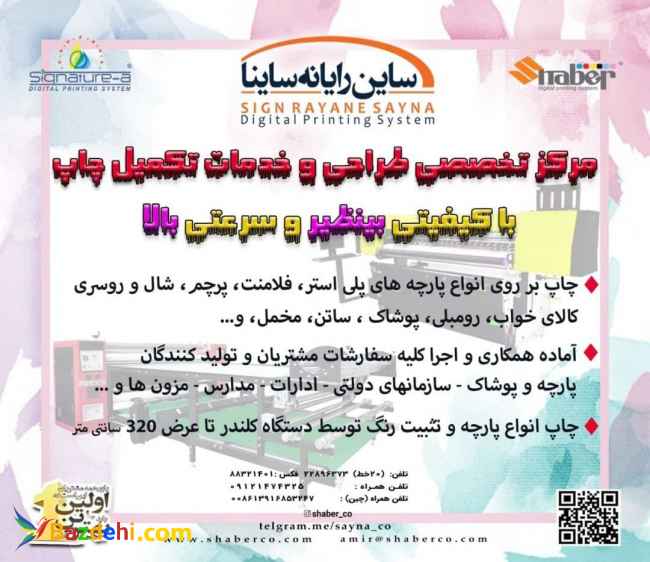 عرضه كننده دستگاه هاي چاپ پارچه و تبليغات محيط شركت ساين رايانه ساينا عرضه كننده دستگاه هاي چاپ پارچه بصورت مستقيم و ترانسفر با كاغذهاي سابليميشن در سايز ١٤٠ الي ٣٢٠ سانتي متر بصورت ٣٥ گرم الي ١٢٠ گرم -و جوهرهاي با كيفيت بالا برای هدهاي اپسون - ريكو - كيوسرا -استارفاير و سرعت چاپ ٥٠ متر الي ٦٥٠ متر در ساعت و كلندر هاي صنعتي و هيتر هاي پر قدرت جهت تثبيت جوهر و انتقال تصوير بر روي پارچه چاپگر پلاتر پرينتر جوهر هد چاپ چاپخانه تبليغات بيلبورد صنعت چاپ پوستر تبليغات محيطي خدمات چاپ كاغذ كاغد ترانسفر كاغذ چاپ خدمات چاپ طراحي قطعات يدكي ماشين الات چاپ دستگاه چاپ چاپ سابليميشن چاپ پارچه چاپ فلكس وبنر فلت بد اكوسالونت چاپ سالونت كارتن پلاست ترانسفر چاپ يووي مديا آدرس تهران اول جاده شهريار شهرك صنعتي گلگون اول شرقي پ ٢٥ تلفن ثابت ٢٢٨٩٦٣٧٣ تلفن همراه ٠٩١٢١٤٧٤٣٢٥ ایمیل این آدرس ایمیل توسط spambots حفاظت می شود. برای دیدن شما نیاز به جاوا اسکریپت دارید آدرس سایت www.shaberco.com کانال تلگرام sayna_co لینک اینستاگرام https://instagram.com/shaber_co?igshid=vh05smmae1qw افست GTO جدیدترین دستگاه چاپ خرید دستگاه چاپ هولوگرام دستگاه تولید کارتن دستگاه چاپ افست دو ورقی دستگاه چاپ برند دستگاه چاپ بنر دستگاه چاپ پارچه دست دوم دستگاه چاپ پارچه فرارنگ دستگاه چاپ تخت پارچه دستگاه چاپ روی پارچه دیجی کالا دستگاه چاپ ژلاتین روی پارچه دستگاه چاپ لوگو دستگاه چاپ ملخی ساخت دستگاه چاپ پارچه فروش دستگاه چاپ روی پارچه در اصفهان فروش لترپرس طلاکوب قطعات دستگاه چاپ افست قیمت دستگاه چاپ افست نیم ورقی قیمت دستگاه چاپ پارچه میماکی قیمت دستگاه چاپ پاکت قیمت دستگاه چاپ دیجیتال قیمت دستگاه چاپ رولند قیمت دستگاه چاپ روی کارتن قیمت دستگاه چاپ کاغذ