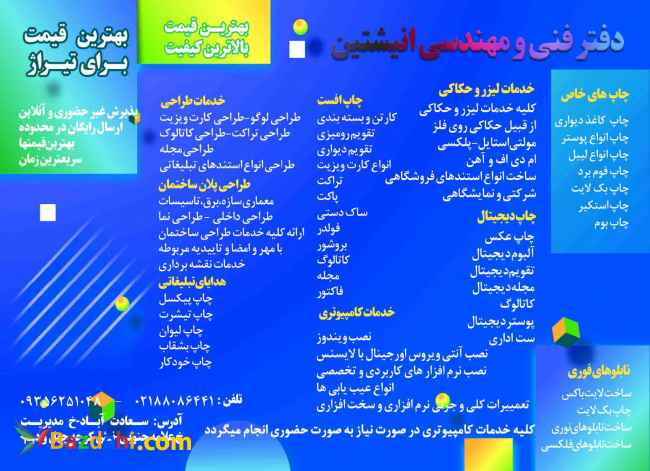 بهترین قیمت و بالاترین کیفیت برای چاپ تیراژ انواع خدمات چاپی و تبلیغاتی کارت ویزیت، تراکت، استند، ماگ، پوستر و ... و تحویل سریع و طراحی خاص فروش انواع لوازم التحریر اداری و مهندسی انجام شیت بندی و پروژه های معماری و ساختمانی تخفیف ویژه پرینت تیراژ برای ادارات و شرکت ها