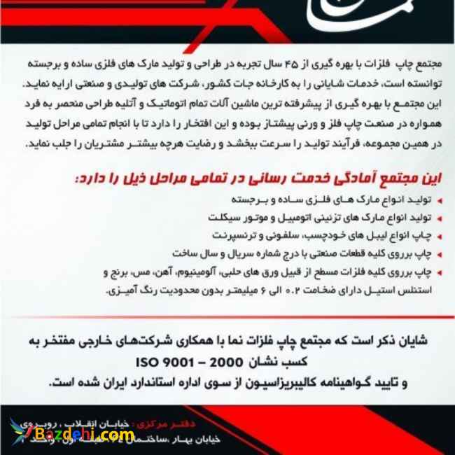 چاپ برروی فلزات مسطح *تولید انواع مارک های فلزی ساده و برجسه. *تولید انواع مارک های تزئینی اتومبیل و موتور سیکلت. *چاپ انواع لیبل های خود چسب، سلفونی و ترنسپرنت. *چاپ برروی کلیه قطعات صنعتی با درج شماره سریال و سال ساخت. *چاپ برروی کلیه فلزات مسطح از قبیل ورق های حلبی، آلومینیومی، آهن، مس، برنج و استنلس تلفن همراه :09124364296 تلفن ثابت :02177619236 آدرس سایت: http://www.chapenama.ir اینستاگرام: https://instagram.com/nama.hq?igshid=YmMyMTA2M2Y= ایمیل این آدرس ایمیل توسط spambots حفاظت می شود. برای دیدن شما نیاز به جاوا اسکریپت دارید نام و نام خانوادگی مسعود صنایع نام واحد تجاری مجتمع چاپ فلزات نما استان تهران شهر تهران آدرس تهران-سه راه افسریه-جاده مشهد-شهرک صنعتی عباس آباد-بلوار ابن سینا-خیابان 21- کوی 4- کوی 4/1پلاک 990 ———————————————————————————— استیل دارای ضخامت 0.2 الی 6 میلیمتر بدون محدودست رنگ آمیزی. انواع چاپ لیبل انواع خدمات چاپ انواع دستگاه چاپ افست انواع دستگاه چاپ دیجیتال انواع دستگاه چاپ صنعتی انواع لیبل پشت چسب دار بزرگترین تولید کننده قطعات خودرو در ایران بهترین برند کاور خودرو پلاک فلزی پشت چسب دار پیگیری سفارش چاپ تاریخچه چاپ فلزی تزئینات اسپرت ماشین پراید تزئینات داخلی خودرو سمند تولید کننده پلاک فلزی چاپ برچسب با طرح دلخواه چاپ برچسب کاغذی چاپ برچسب لوگو چاپ پلاک فلزی چاپ پلاک ماشین چاپ تامپو روی ماسک چاپ حرارتی روی فلز چاپ رنگی روی استیل چاپ روی آلومینیوم چاپ روی فلز رنگی چاپ روی کاغذ پوستی چاپ روی کاغذ کوتد چاپ روی مقوای ضخیم چاپ روی ورق فلزی چاپ سربرگ چاپ فلز چیست چاپ فلزات چاپ کارت ویزیت آنلاین چاپ کاغذ بسته بندی چاپ کاغذ تحریر چاپ لیبل pvc چاپ لیبل پشت چسب دار چاپ لیبل تعداد کم چاپ لیبل دایره ای چاپ لیبل شیشه ای چاپ لیبل شیشه ای تعداد کم چاپ مدرن چاپخانه خدمات چاپ خرید اینترنتی ورق برنج خرید اینترنتی ورق برنج خوراکی خرید پد دستگاه تامپو خرید دستگاه چاپ دستگاه تامپو سپاس دست دوم دستگاه چاپ برجسته روی فلز دستگاه چاپ بنر دستگاه چاپ تامپو دستگاه چاپ تامپو رومیزی سپاس دستگاه چاپ دیجیتال کاغذ دستگاه چاپ روی فلز دستگاه چاپ روی فویل آلومینیوم دستگاه چاپ روی قطعات پلاستیکی دستگاه چاپ فلز مایلندر دستگاه چاپ قدیمی دستگاه های چاپ صنعتی دستگاه های معروف در چاپ قدیم چه نام داشتند دیجی کالا تزئینات خودرو دیجی کالا تزئینات خودرو پراید ساخت برچسب لوگو سفارش برچسب تبلیغاتی طرح لیبل شمع فروش ورق برنجی در تهران قیمت چاپ روی مقوا قیمت چاپ عکس روی فلز قیمت چاپ کاغذ پوستی قیمت چاپ کاغذ گلاسه قیمت چاپ لیبل قیمت دستگاه چاپ تامپو تک رنگ قیمت دستگاه چاپ دیجیتال رنگی قیمت دستگاه چاپ دیجیتال صنعتی قیمت دستگاه چاپ دیجیتال کاغذ قیمت دستگاه چاپ دیجیتال کتاب قیمت دستگاه چاپ رنگی روی فلز قیمت مارک فلزی قیمت ورق برنج قیمت ورق برنج کیلویی کاربرد دستگاه چاپ لوازم تزئینی داخل خودرو لوازم تزئینی ماشین لیبل فلزی لباس لیست قیمت چاپ کهن مارک فلزی لباس نام دستگاه چاپ قدیمی نمونه برچسب تبلیغاتی ورق برنج از کجا بخرم ورق برنج برای معرق ورق برنج چیست ورق برنجی ورق برنجی ورق برنجی پامنار ورق برنجی زیورالات وزن ورق برنج
