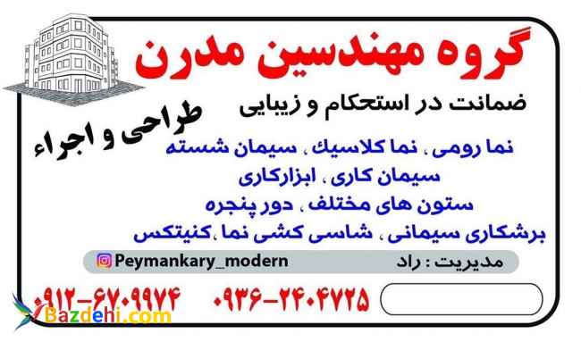 گروه مهندسین مدرن ضمانت دراستحکام وزیبایی طراحی و اجرإ نما رومی،نما کلاسیک،سیمانکاری وشسته،قلمدانی،ابزارباند، ستون های مختلف،دور پنجره،برش کاری سیمانی ، شاسی کشی نما،ارائه نمونه کاردرحال اجراء تیم اجراء کرامتی راد 09126709974 @peymankary_modern