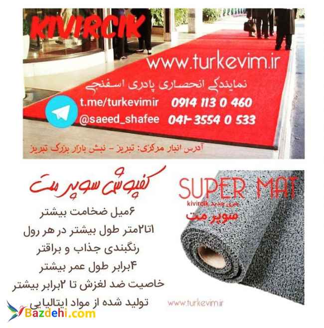 این محصول چند منظوره سری جدید سوپرمت تولید کارخانه kivircik ترکیه میباشد که توسط نمایندگی انحصاری تورک اویم، مستقیم و بدون واسطه با قیمت درب کارخانه در سراسر کشور توزیع میگردد ابعاد رول کامل:به عرض یک متر و طول ۱۶متر و تراکم بالا با ضخامت 16 میل با برگه و برچسب اصالت کالا. قابلیت برش در سایز و شکل دلخواه بدون از دست رفتن بافت و استحکام محصول تنوع رنگ: سبز،آبی،قهوه ای،کرم،زرشکی،قرمز،مشکی ،طوسی موارد استفاده:جلوی درب اماکن ،روی پله ها،کف فضاهای دارای احتمال لغزندگی،راهروها،لابی اماکن،کف آسانسور ،کف پاگرد ،دور استخر،سرویس بهداشتی،کف تراس ،فضاهای ورزشی و تفریحی،فرش تشریفات تالار،هتل،فرودگاه،رستوران،کافه تماس و سفارش: ارسال عمده وخرده سریع و مطمئن به سراسر کشور t.me/turkevimir : آدرس کانال تلگرام https://www.turkevim.ir : آدرس سایت ۰۴۱۳۵۵۴۰۵۳۳ - ۰۹۱۴۱۱۳۰۴۶۰ - ۰۹۳۶۸۵۵۶۵۶۸ آدرس دفتر مرکزی:تبریز-نبش بازار بزرگ تبریز-نمایندگی تورک اویم
