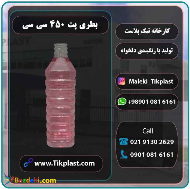 امروزه صنعت بسته بندی وابستگی بسیاری به پلاستیک دارد و ظروف بسیار متنوعی برای بسته بندی و نگه داری محصولات مختلف طراحی و تولید می شوند. کارخانه تیک پلاست طراح و تولید کننده انواع ظروف پلاستیکی پت و پلی اتیلن است و بیش از 200 نوع بطری مختلف را با ظاهر مختلف طراحی و تولید می کند.بطری پت 450 سی سی چهار گوش یکی از پت های پر طرفدار است و با توجه به ظرفیت متوسطی که دارد در مصارف متعددی مورد استفاده قرار می گیرد. قیمت ظروف پت با توجه به عوامل مختلفی تغییر پیدا می کند ، اما با توجه به اینکه کارخانه تیک پلاست به صورت مستقیم در این صنعت فعالیت می کند و از تهیه مواد اولیه تا تولید و فروش محصول را بدون حضور واسطه انجام می دهد به همین دلیل قیمت بسیار مناسب تری را برای فروش محصول در نظر می گیرد. تولید کنندگان pet در ایران که تمامی استاندارد های لازم را در تولید ظروف پت رعایت کند تعداد کمی دارند ، اما کارخانه تیک پلاست با رعایت تمامی شیوه نامه های بهداشتی و ایمنی ظروف پت را تولید می کند ، بنابراین می توانید با اطمینان خاطر از این ظروف استفاده کنید. قیمت انواع پت قیمت پت خالی قیمت عمده بطری پت بطری 400 سی سی پت قیمت بطری پلاستیکی 500 سی سی بطری 450 سی سی پت درجه یک خرید بطری پت آبمیوه خرید بطری 500 سی سی فروش عمده ظروف و بطری پت 450 سی سی برای خرید انواع ظروف پلاستیکی شوینده در تهران ، کرج ، اصفهان ، شیراز ، اهواز ، مشهد ، یزد ، کرمان ، کرمانشاه ، مازندران ، گیلان ، بندر عباس ، زاهدان ، ایلام ، تبریز ، ارومیه ، اردبیل و سایر شهر ها با شماره های زیر تماس بگیرید . مدیر فروش : ۰۹۰۱۰۸۱۶۱۶۱ خط ثابت : ۰۲۱۹۱۳۰۲۶۲۹