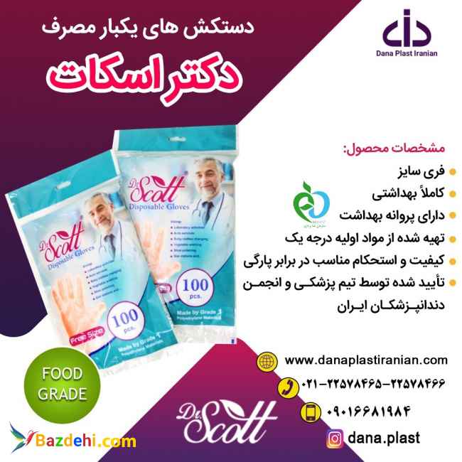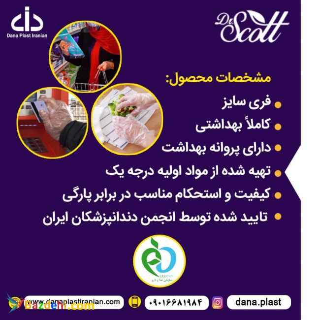 دستکش بزرگسال: مشخصات محصول: فری سایز کاملا بهداشتی دارای پروانه بهداشت تهیه شده از مواد اولیه درجه یک کیفیت و استحکام مناسب در برابر پارگی تایید شده توسط انجمن دندان پزشکان ایران