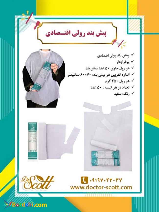 پرفراژ دار هر رول حاوی 50 عدد پیش بند اندازه تقریبی هر پیشبند: 70*60 سانتیمتر هر رول 250 گرم تعداد در هر کیسه 50 عدد رنگ سفید