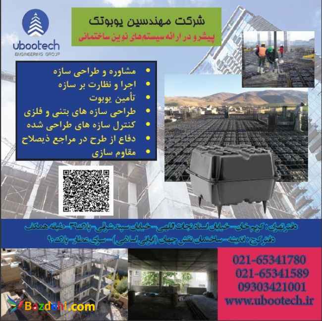 فعالیت شرکت یوبوتک: 1. مشاوره و طراحي سازه 2. اجرا و نظارت بر سازه 3. تأمين يوبوت 4. طراحي سازه هاي بتني و فلزي 5. کنترل سازه هاي طراحي شده 6. دفاع از طرح در مراجع ذيصلاح 7. مقاوم سازي مزایای سقف دال مجوف یوبوت و وافل : امکان استفاده بهينه از فضاي معماري با کاهش تعداد ستونها و ايجاد دهانهي بلند امکان تغيير فضاهاي کاربري پس از ساخت حذف آويز تيرهاي سقف امکان ستونگذاري نامنظم در پلان کاهش مصرف بتن و ميلگرد در دهانه های بلند هزينه کمتر قالببندي در سقف وافل مقاوم در برابر انتقال صوت و حرارت عدم توليد گازهاي سمي در آتشسوزي سهولت و سرعت بالا در اجراي سقف قابليت اجرا در هر نقطه از کشور مدیرعامل: مهندس باهر