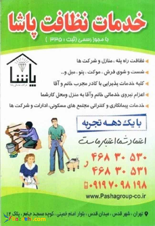 برچسب : جاده مخصوص ، قدیم ، شهرقدس ، قلعه حسن خان ، لشگری ، فتح ، ورآورد ، شهریار ، اندیشه ، مارلیک ، گرمدره ، اتوبان ، ایرانخودرو ، سایپا ، دارو ، رازک ، سها ، داروسازی خدمات نظافت پاشا - نظافت راه پله، منازل و شرکت ها - شست وشوی فرش، موکت،پتو،مبل و... - کلیه خدمات پذیرایی با کادر مجرب خانم و آقا - اعزام نیروی خدماتی خانم وآقا به منزل و محل کار شما - خدمات پیمانکاری و کنتراتی مجتمع های مسکونی ، ادرات و شرکت ها • اعتماد شما اعتبار ماست... شماره تماس: 021-46830530 021-46830531 09197098198 آدرس سایت: www.pashagroup-co.ir آدرس : تهران ، کیلومتر 20 جاده کرج ،شهرقدس (قلعه حسن خان ) ،میدان قدس ، بلوار امام خمینی ،جنب مسجدجامع ،پلاک 63 واحد 3