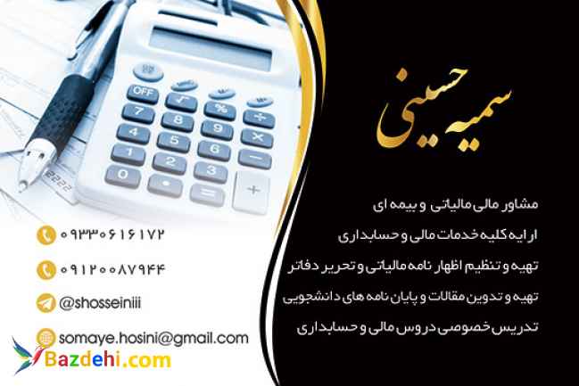 *انجام کلیه امور مالی،مالیاتی و حسابداری شرکتها،فروشگاهها و اصناف *انجام انواع اظهارنامه های فصلی ،ارزش افزوده و عملکرد *تحریر دفاتر قانونی *انجام امور حسابداری با انواع نرم افزارها و بصورت دستی *تجزیه و تحلیل صورتهای مالی به منظور بهبود در تصمیم گیریهای مالی *انجام امور بیمه و مالیات لیست پرسنل *طراحی و راه اندازی سیستم حسابداری کلیه فروشگاه ها و رستوران ها و تالار پذیرایی و شرکتها و موسسات تجاری توسط کارشناس ارشد مالی با سابقه کاری *اعزام حسابدار و اموزش حسابدار *معرفی،نصب و راه اندازی نرم افزار مالی. *طراحی اصولی کدینگ حسابداری متناسب با نوع فعالیت شرکت ها طبق استانداردهای تدوین شده. *بررسی، تهیه ،تنظیم،کنترل و بایگانی اسناد حسابداری. *بروز رسانی اسناد معوق و ثبت روزانه و ماهانه اسناد و ارایه گزارشات مالی ترازنامه و سودوزیان و بستن حسابها *تهیه/تنظیم دفاعیات و اعتراض مالیاتی *تهیه/تنظیم لوایح قانونی *بابت تعدیل/تخفیف/بخشودگی/کاهش/هزینه های مالیاتی و جرائم (مشاغل/شرکت ها/مستغلات/ارث/سکه) حضوری/غیرحضوری/پاره وقت/پروژه ای/فصلی/دورکاری = تمام تهران شماره تماس:09120087944-09353136533