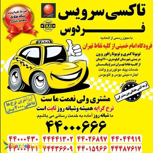 تاکسی سرویس فردوس با مجوز رسمی و ربع قرن سابقه در مدیریت و اجرای تاکسی سرویس وپیک موتوری شبانه روزی خدمات کاملی را برای مشتریان ارایه می دهد. دارای چندین شعبه در تهران می باشد. (قرعه کشی هفتگی بین کلیه مشترکین) خدمات قابل ارایه: - بیشترین آرم طرح ترافیک - بهترین کادر مجرب - تاکسی دراختیار-آماده عقد قرارداد جهت سرویس مدارس ارگانها و نهادها - خدمات شبانه روزی -تاکسی فرودگاه امام خمینی ارزان شامل تویوتا کمری ،تویوتا رافور،ون،هایس،مینی بوس،اجاره اتوبوس - خدمات سریع السیر پیک -سرویس های درون شهری وبرون شهری و کیلومتری-حمل بار شهرستان-حمل باردرون شهری-حمل بسته شهرستان-حمل بسته برون شهری-انجام کلیه امورپستی-انجام اموربارنامه-انجام اموبارنامه هوائی وزمینی تاکسی دربستی،تاکسی دربست،تاکسی شهرستان دربستی،تاکسی دربست شهرستان،تاکسی دربستی بین شهری،تاکسی دربستی درون شهری،تاکسی دربست درون شهری، دربست، تاکسی فرودگاه امام خمینی - تاکسی فرودکاه امام خمینی -تویوتا کمری فرودگاه امام- تویوتا رافورفرودگاه امام -ون فرودگاه امام خمینی- رزرو ون فرودگاه امام خمینی -تاکسی شهرستان- رزروتاکسی شهرستان- تاکسی کیلومتری شهرستان -اجاره اتوبوس -تاکسی فرودگاه امام خمینی نزدیک-تاکسی دراختیار-تاکسی دربست—تاکسی دراختیار تهران-تاکسی دربست—تاکسی vip دراختیار-تاکسی دراختیار شهرستان-تاکسی دربست دراختیار-تاکسی دربستی شهرستان--تاکسی دربست شهرستان-تاکسی دراختیار-رزرو تاکسی دربست--رزرو تاکسی دربست شهرستان تویوتا کمری فرودگاه امام خمینی،تویوتا رافورفرودگاه امام،ون، حمل بار برون شهری تاکسی شهرستان بارنامه هوائی و زمینی حمل بار شهرستان حمل مرسوله به شهرستان حمل بسته درون شهری و برون شهری حمل بار به شهرستان حمل بسته ازتهران –سایت وانت بارفردوس-سایت تاکسی فردوس-سایت تاکسی تلفنی فردوس-سایت پیک موتوری فردوس-سایت تاکسی فرودگاه امام خمینی-سایت ون فرودگاه امام خمینی-سایت رزرو تاکسی بین شهری-سایت تاکسی دربستی شهرستان –سایت ون شهرستان شماره تماس 46013758-46013762-44431400-44487602-44487662-44487692-44487617-44487598-44487765-44436609-44441302-44026843-44026895-44026897-44044919-44015966-44000430-44000431-44000432-44000433-44000666 مسیر مبدا تاکسی شهرستان در قم تاکسی شهرستان در متل قو تاکسی شهرستان در همدان تاکسی شهرستان در کرمانشاه تاکسی شهرستان در کاشان تاکسی شهرستان در کرمان تاکسی شهرستان در محمودآباد تاکسی شهرستان در آمل تاکسی شهرستان در چمستان تاکسی شهرستان در قائم شهر تاکسی شهرستان در تنکابن تاکسی شهرستان در آبادان تاکسی شهرستان در اراک تاکسی شهرستان در بندرعباس تاکسی شهرستان در بندرانزلی تاکسی شهرستان در قزوین تاکسی شهرستان در میانه تاکسی شهرستان در یاسوج تاکسی شهرستان در بروجرد تاکسی شهرستان در اشتهارد تاکسی شهرستان در ابیانه تاکسی شهرستان در اردبیل تاکسی شهرستان در ارومیه تاکسی شهرستان در دماوند تاکسی شهرستان در کردان تاکسی شهرستان در بومهن تاکسی شهرستان در پردیس تاکسی شهرستان در رودهن تاکسی شهرستان در قزوین تاکسی شهرستان در مرند تاکسی شهرستان در شهرک صنعتی اشتهارد تاکسی شهرستان در شهرک صنعتی کاسپین تاکسی شهرستان در شهرک صنعتی چرمشهر تاکسی شهرستان در شهرک صنعتی شمس آباد تاکسی شهرستان در شهرک صنعتی ایوانکی تاکسی شهرستان در شهرک صنعتی گلگون تاکسی شهرستان در شهرک صنعتی مامونیه تاکسی شهرستان در شهرک صنعتی عباس آباد تاکسی شهرستان در شهرک صنعتی ساوه تاکسی شهرستان در شهرک صنعتی سلفچگان تاکسی شهرستان در تبریز تاکسی شهرستان در رشت تاکسی شهرستان در اصفهان تاکسی شهرستان در آستارا تاکسی شهرستان در سبزوار تاکسی شهرستان در ایوانکی تاکسی شهرستان در عباس آباد تاکسی شهرستان در طالقان تاکسی شهرستان در هشتگرد تاکسی شهرستان در لواسان تاکسی شهرستان در کاشان تاکسی شهرستان در خمین تاکسی شهرستان در زاهدان تاکسی شهرستان در زنجان تاکسی شهرستان در ساری تاکسی شهرستان در سمنان تاکسی شهرستا