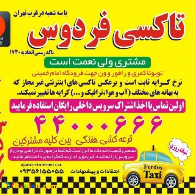 تاکسی سرویس فردوس با مجوز رسمی و ربع قرن سابقه در مدیریت و اجرای تاکسی سرویس وپیک موتوری شبانه روزی خدمات کاملی را برای مشتریان ارایه می دهد. دارای چندین شعبه در تهران می باشد. (قرعه کشی هفتگی بین کلیه مشترکین) خدمات قابل ارایه: - بیشترین آرم طرح ترافیک - بهترین کادر مجرب - تاکسی دراختیار-آماده عقد قرارداد جهت سرویس مدارس ارگانها و نهادها - خدمات شبانه روزی -تاکسی فرودگاه امام خمینی ارزان شامل تویوتا کمری ،تویوتا رافور،ون،هایس،مینی بوس،اجاره اتوبوس - خدمات سریع السیر پیک -سرویس های درون شهری وبرون شهری و کیلومتری-حمل بار شهرستان-حمل باردرون شهری-حمل بسته شهرستان-حمل بسته برون شهری-انجام کلیه امورپستی-انجام اموربارنامه-انجام اموبارنامه هوائی وزمینی تاکسی دربستی،تاکسی دربست،تاکسی شهرستان دربستی،تاکسی دربست شهرستان،تاکسی دربستی بین شهری،تاکسی دربستی درون شهری،تاکسی دربست درون شهری، دربست، تاکسی فرودگاه امام خمینی - تاکسی فرودکاه امام خمینی -تویوتا کمری فرودگاه امام- تویوتا رافورفرودگاه امام -ون فرودگاه امام خمینی- رزرو ون فرودگاه امام خمینی -تاکسی شهرستان- رزروتاکسی شهرستان- تاکسی کیلومتری شهرستان -اجاره اتوبوس -تاکسی فرودگاه امام خمینی نزدیک-تاکسی دراختیار-تاکسی دربست—تاکسی دراختیار تهران-تاکسی دربست—تاکسی vip دراختیار-تاکسی دراختیار شهرستان-تاکسی دربست دراختیار-تاکسی دربستی شهرستان--تاکسی دربست شهرستان-تاکسی دراختیار-رزرو تاکسی دربست--رزرو تاکسی دربست شهرستان تویوتا کمری فرودگاه امام خمینی،تویوتا رافورفرودگاه امام،ون، حمل بار برون شهری تاکسی شهرستان بارنامه هوائی و زمینی حمل بار شهرستان حمل مرسوله به شهرستان حمل بسته درون شهری و برون شهری حمل بار به شهرستان حمل بسته ازتهران –سایت وانت بارفردوس-سایت تاکسی فردوس-سایت تاکسی تلفنی فردوس-سایت پیک موتوری فردوس-سایت تاکسی فرودگاه امام خمینی-سایت ون فرودگاه امام خمینی-سایت رزرو تاکسی بین شهری-سایت تاکسی دربستی شهرستان –سایت ون شهرستان شماره تماس 46013758-46013762-44431400-44487602-44487662-44487692-44487617-44487598-44487765-44436609-44441302-44026843-44026895-44026897-44044919-44015966-44000430-44000431-44000432-44000433-44000666 مسیر مبدا تاکسی شهرستان در قم تاکسی شهرستان در متل قو تاکسی شهرستان در همدان تاکسی شهرستان در کرمانشاه تاکسی شهرستان در کاشان تاکسی شهرستان در کرمان تاکسی شهرستان در محمودآباد تاکسی شهرستان در آمل تاکسی شهرستان در چمستان تاکسی شهرستان در قائم شهر تاکسی شهرستان در تنکابن تاکسی شهرستان در آبادان تاکسی شهرستان در اراک تاکسی شهرستان در بندرعباس تاکسی شهرستان در بندرانزلی تاکسی شهرستان در قزوین تاکسی شهرستان در میانه تاکسی شهرستان در یاسوج تاکسی شهرستان در بروجرد تاکسی شهرستان در اشتهارد تاکسی شهرستان در ابیانه تاکسی شهرستان در اردبیل تاکسی شهرستان در ارومیه تاکسی شهرستان در دماوند تاکسی شهرستان در کردان تاکسی شهرستان در بومهن تاکسی شهرستان در پردیس تاکسی شهرستان در رودهن تاکسی شهرستان در قزوین تاکسی شهرستان در مرند تاکسی شهرستان در شهرک صنعتی اشتهارد تاکسی شهرستان در شهرک صنعتی کاسپین تاکسی شهرستان در شهرک صنعتی چرمشهر تاکسی شهرستان در شهرک صنعتی شمس آباد تاکسی شهرستان در شهرک صنعتی ایوانکی تاکسی شهرستان در شهرک صنعتی گلگون تاکسی شهرستان در شهرک صنعتی مامونیه تاکسی شهرستان در شهرک صنعتی عباس آباد تاکسی شهرستان در شهرک صنعتی ساوه تاکسی شهرستان در شهرک صنعتی سلفچگان تاکسی شهرستان در تبریز تاکسی شهرستان در رشت تاکسی شهرستان در اصفهان تاکسی شهرستان در آستارا تاکسی شهرستان در سبزوار تاکسی شهرستان در ایوانکی تاکسی شهرستان در عباس آباد تاکسی شهرستان در طالقان تاکسی شهرستان در هشتگرد تاکسی شهرستان در لواسان تاکسی شهرستان در کاشان تاکسی شهرستان در خمین تاکسی شهرستان در زاهدان تاکسی شهرستان در زنجان تاکسی شهرستان در ساری تاکسی شهرستان در سمنان تاکسی شهرستا